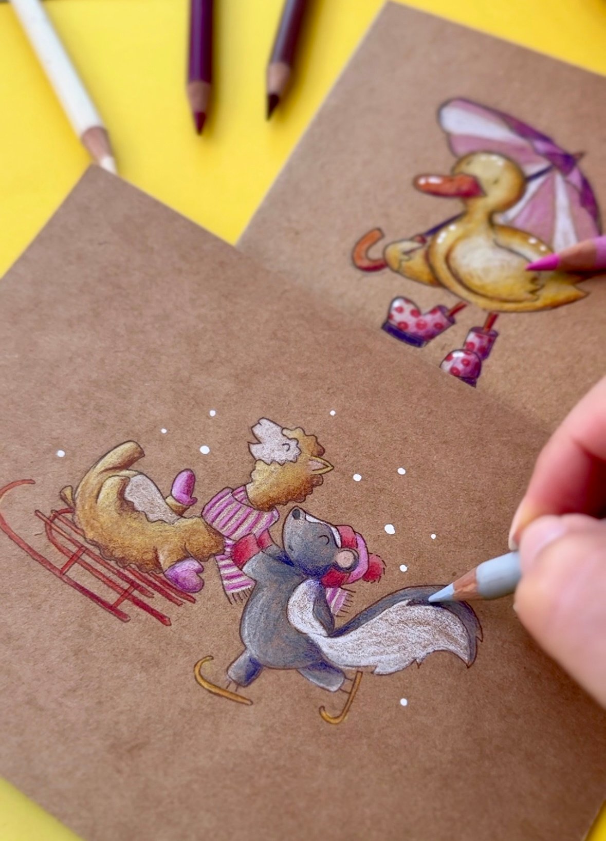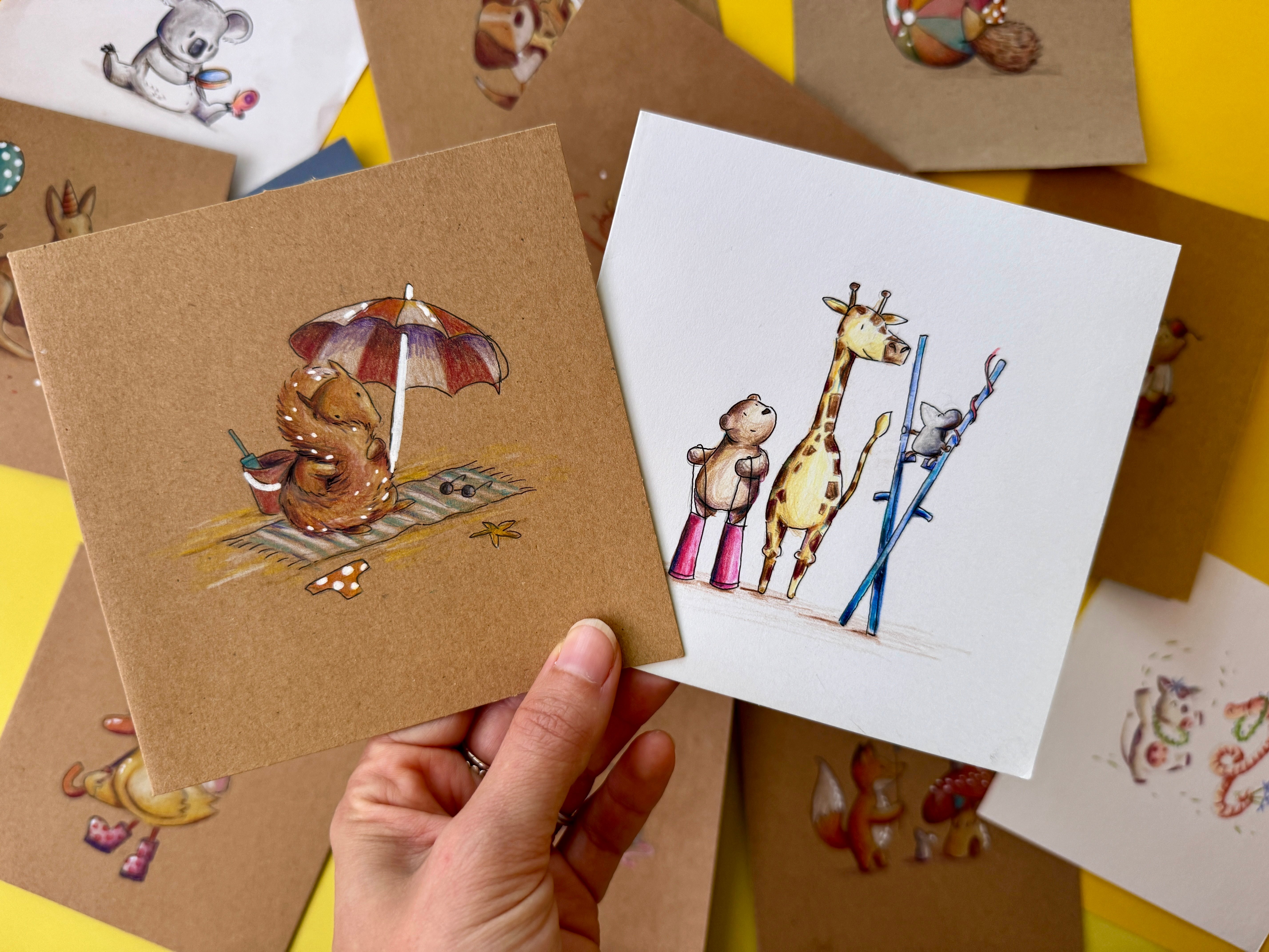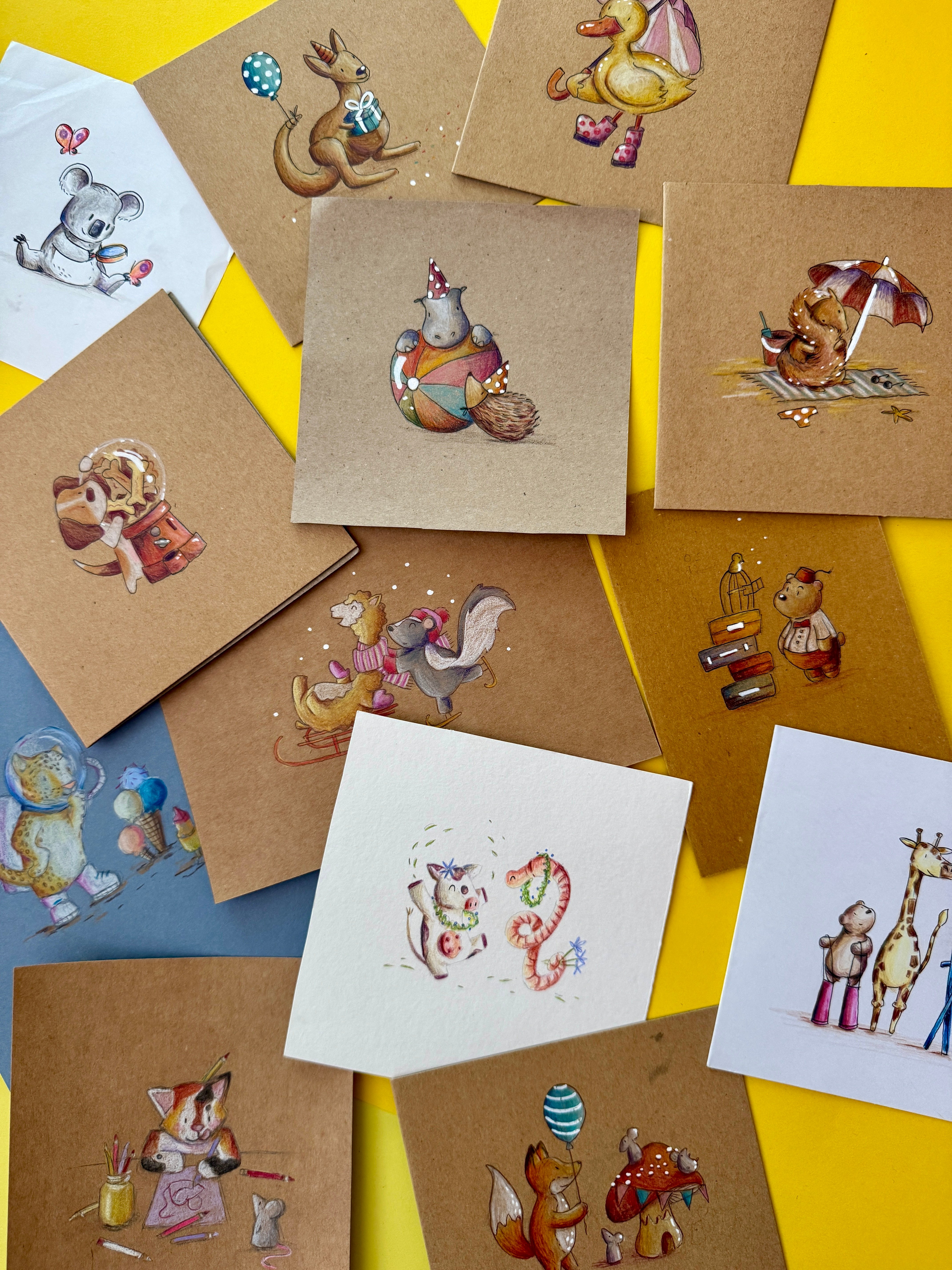 De diertjes die ik teken hebben een vrolijke, cartoon-achtige stijl. Dat maakt ze zo gezellig om in allerlei posities te manoeuvreren! Je hoeft namelijk geen natuurgetrouw diertje te tekenen om iets moois te maken.