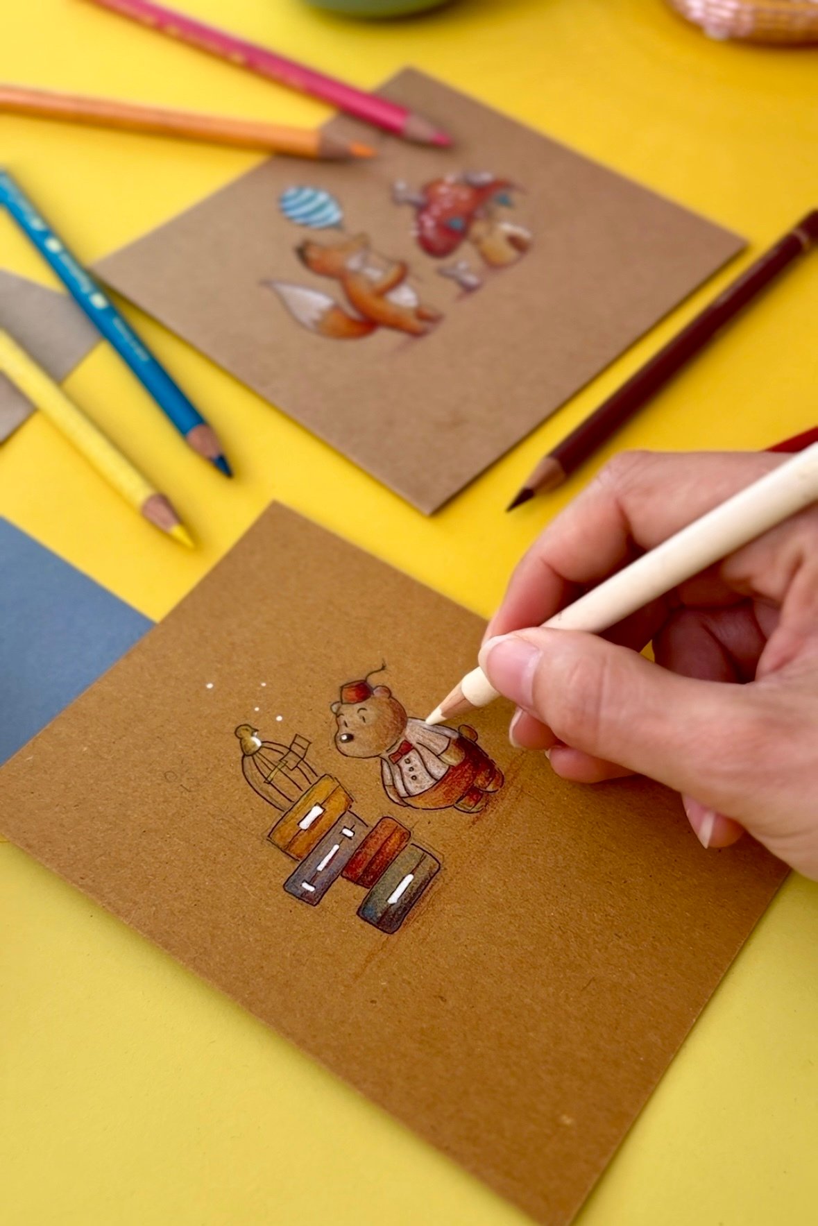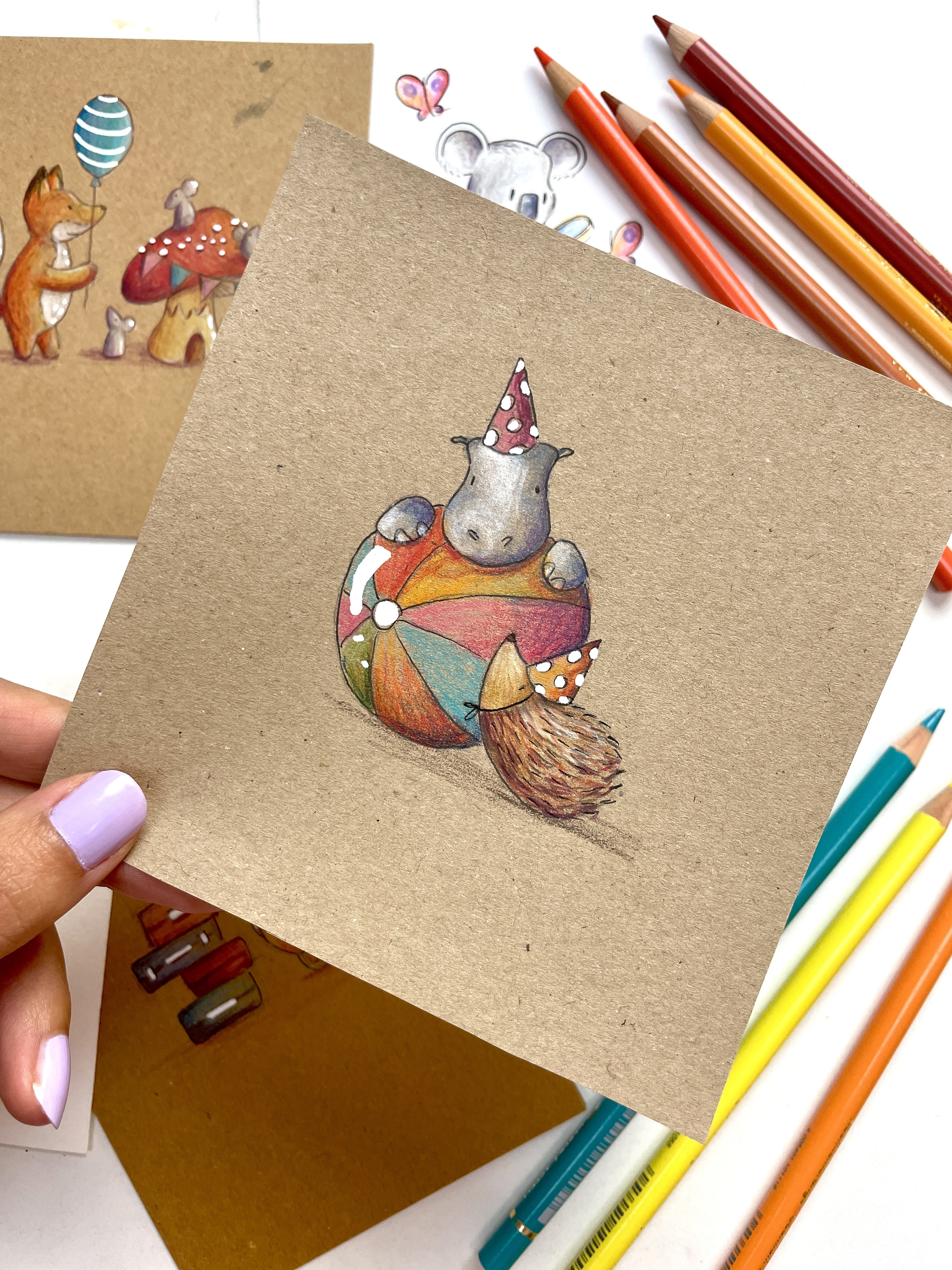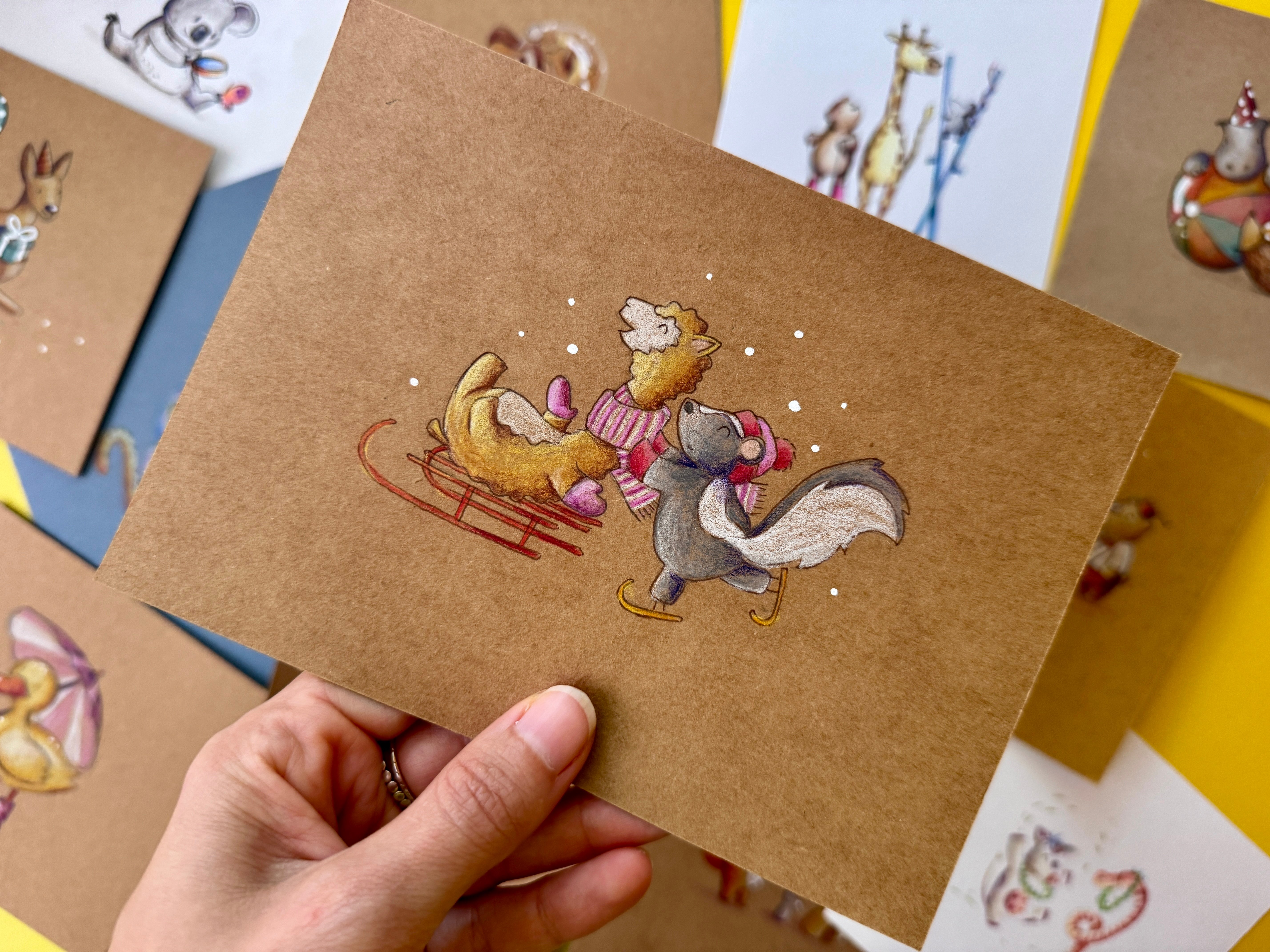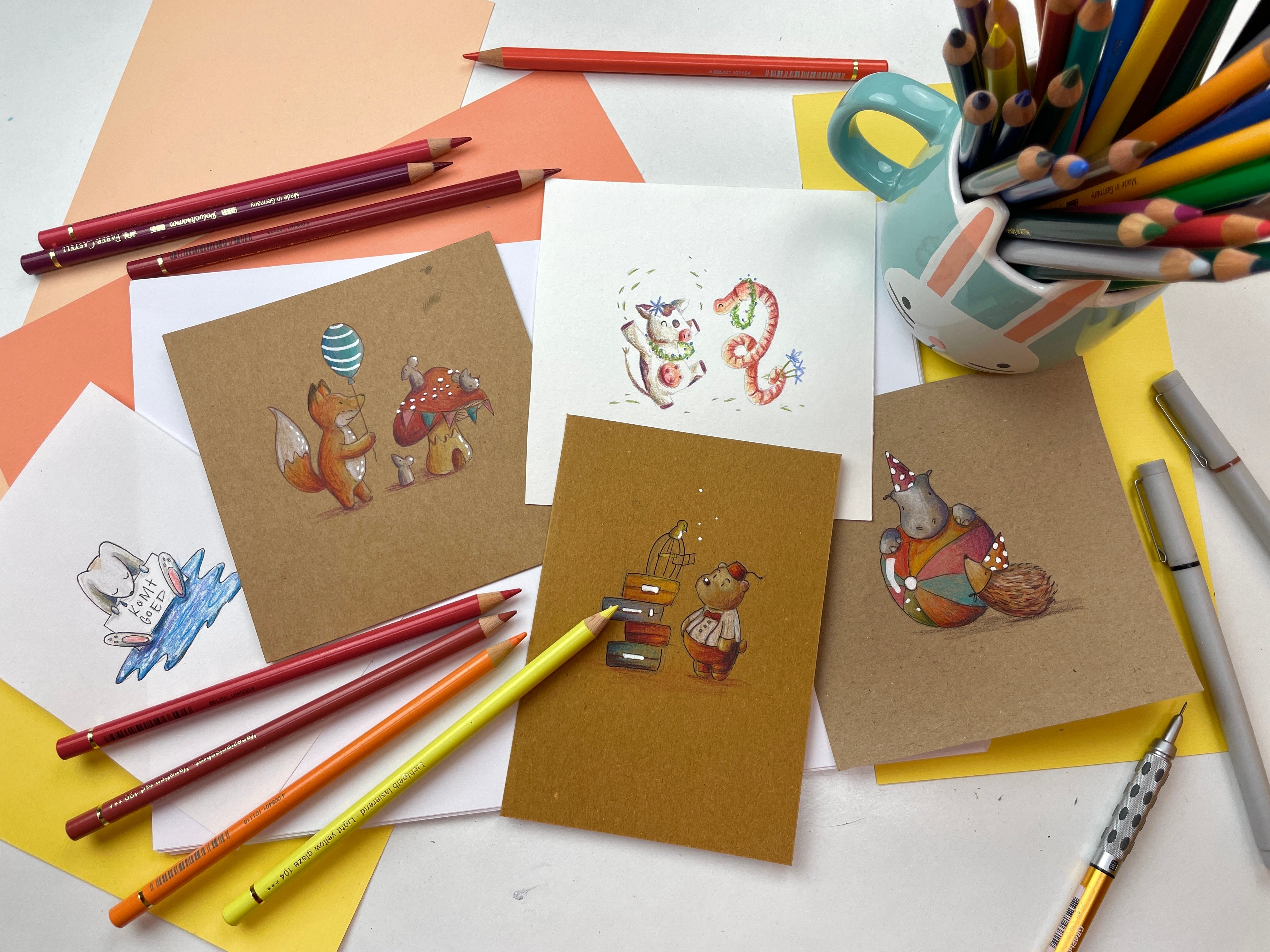 De diertjes die ik teken hebben een vrolijke, cartoon-achtige stijl. Dat maakt ze zo gezellig om in allerlei posities te manoeuvreren! Je hoeft namelijk geen natuurgetrouw diertje te tekenen om iets moois te maken.