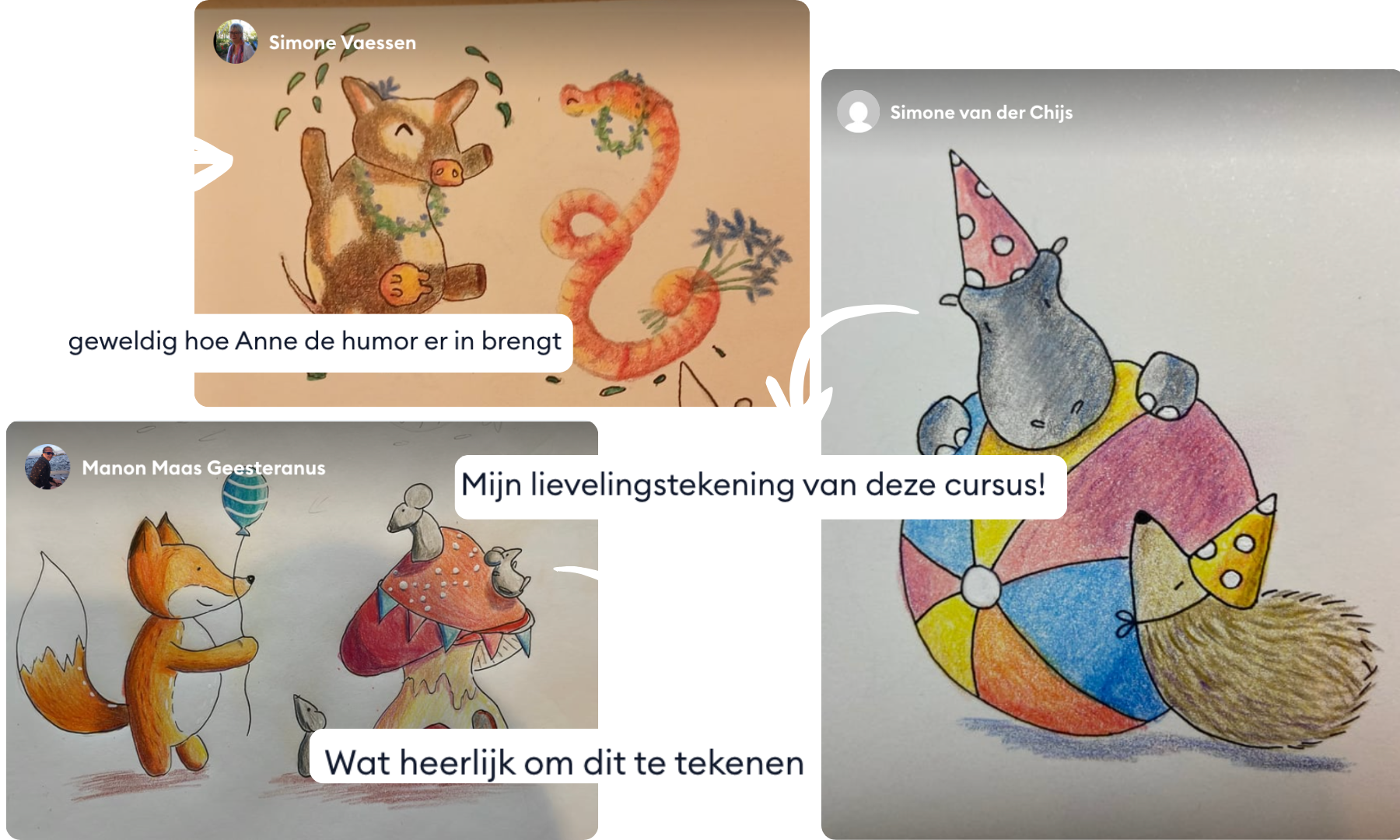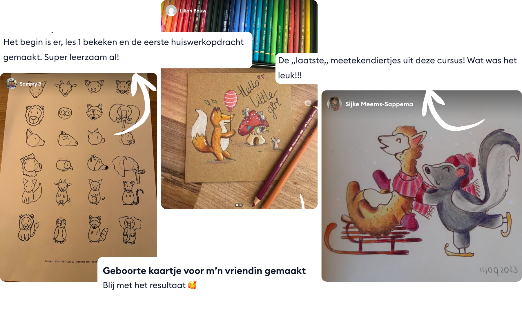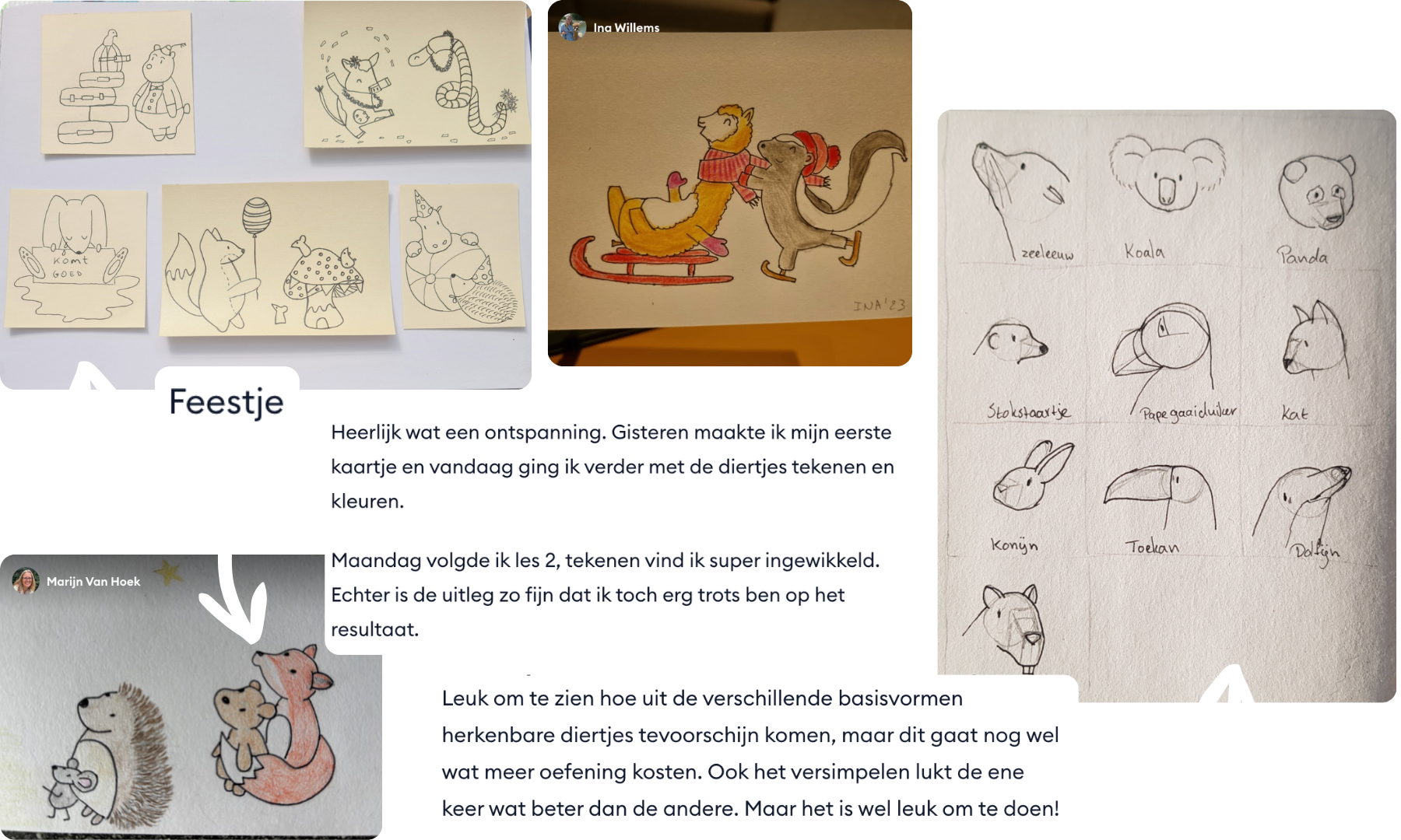 "Nooit gedacht dat ik het zou kunnen, durfde de stap maar niet te zetten want geen idee hoe te beginnen, maar uiteindelijk toch de stap gewaagd door deze cursus te gaan volgen en Anne maakt het gewoon waar dat je binnen no time diertjes leert tekenen.