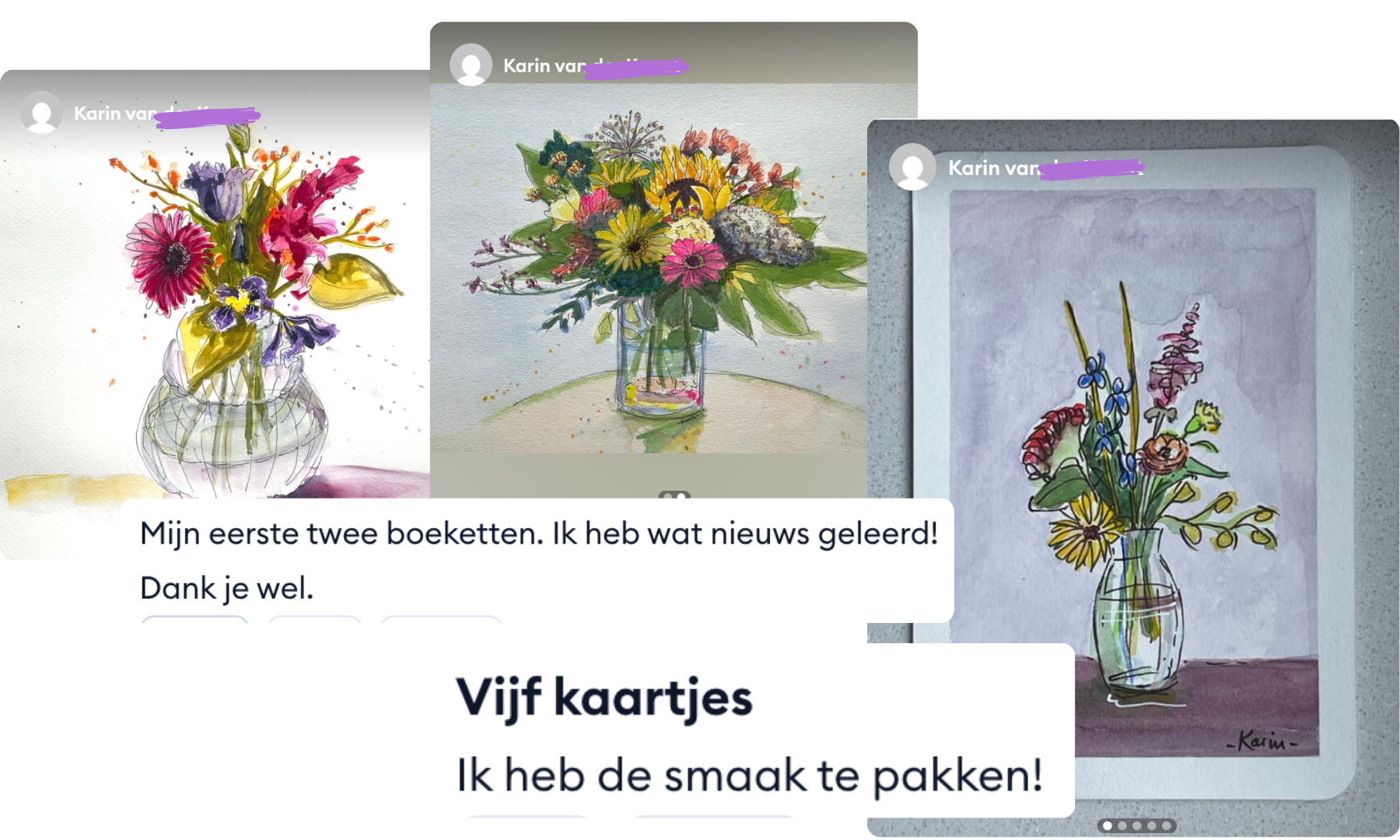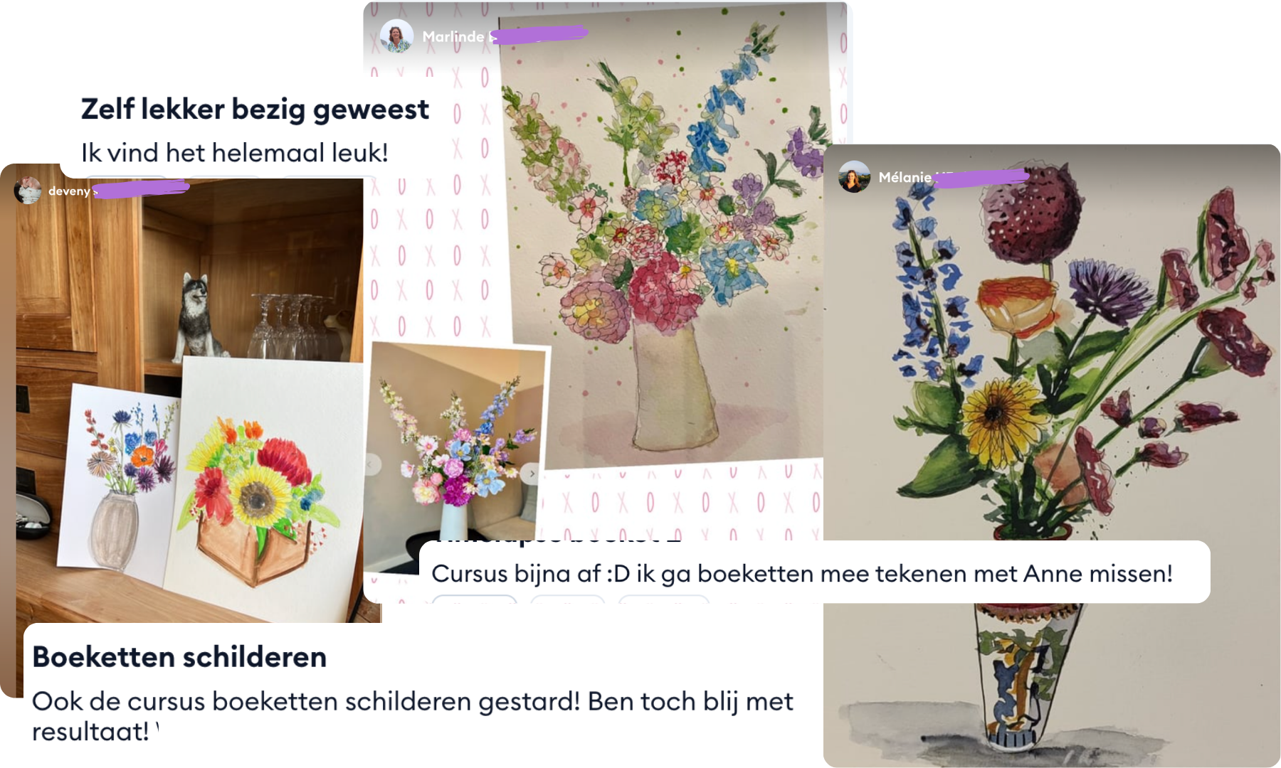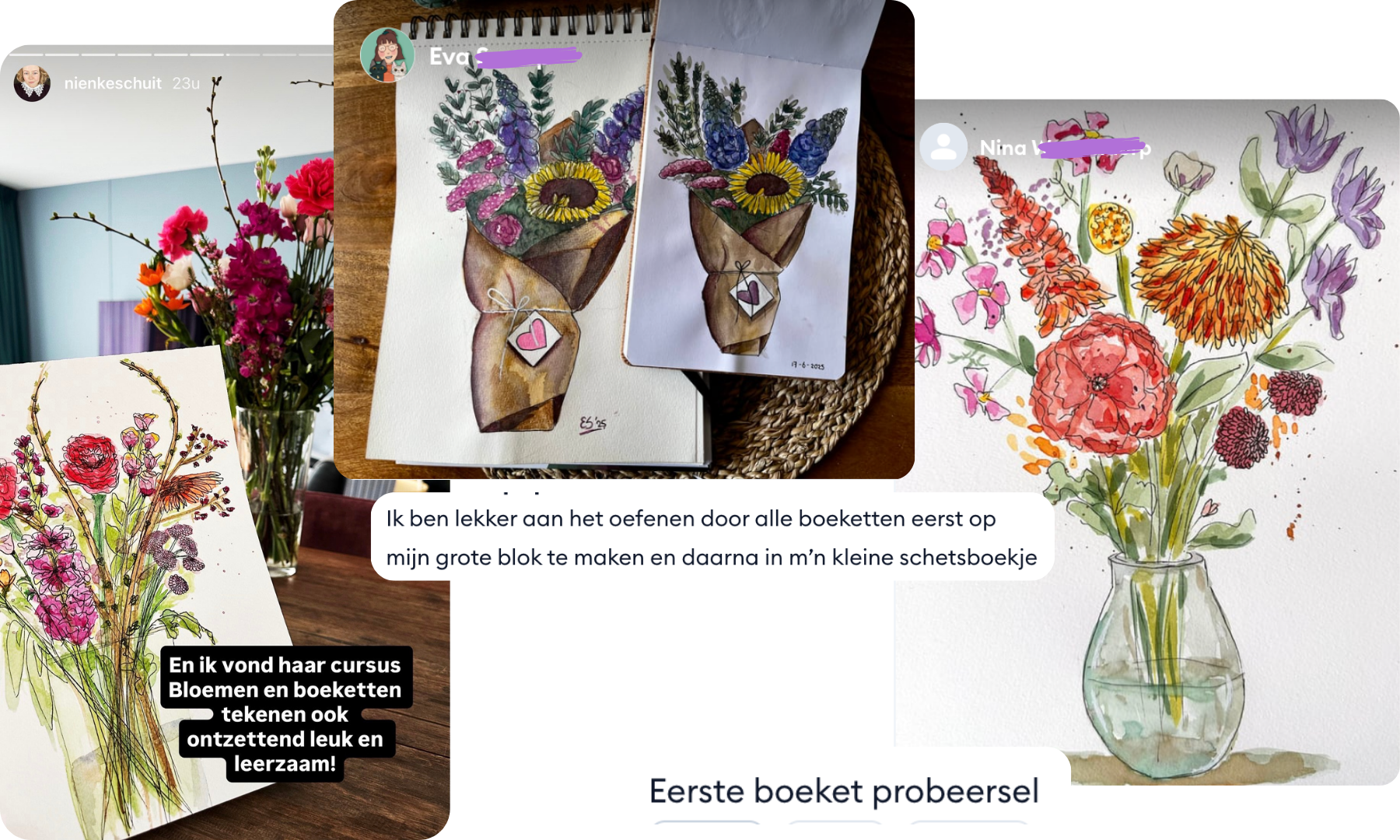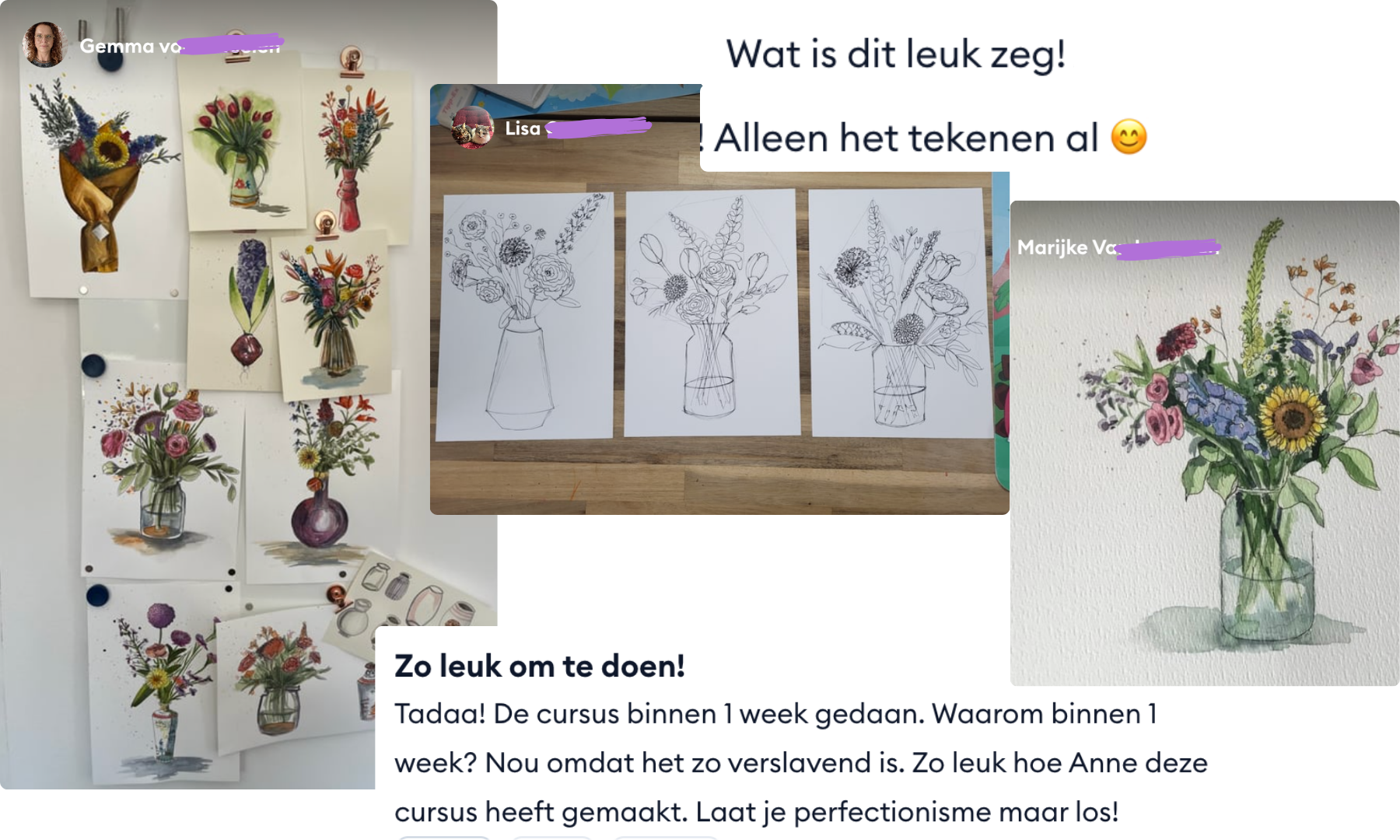 "Zoveel geleerd! Superleuke cursus, ik wist niet dat ik het in me had, maar na het volgen van deze cursus kan zelfs ik een leuk boeket en mooie bloemen tekenen"