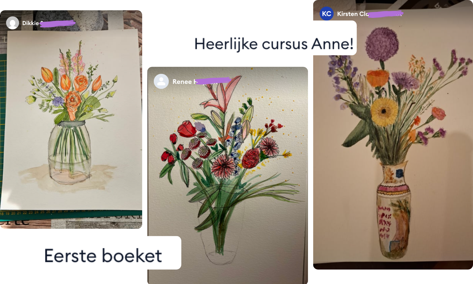 "Wederom genoten van een cursus van Anne! Ik heb helemaal geen talent voor aquarellen (mijn perfectionisme zit in de weg maar ik heb zo genoten van de creatieve, gezellige video's. Je wordt moeiteloos meegenomen in Anne's inspirerende manier van tekenen. Haar enthousiasme werkt aanstekelijk en voilá ineens staan er zomaar hele fleurige, gezellige, imperfecte, maar oh zo leuke boeketten op papier. Bedankt, Anne!"