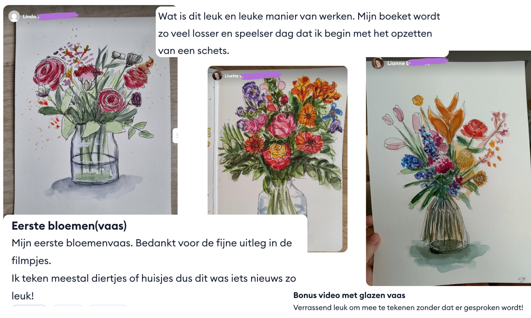 "Ik wilde altijd al graag boeketten natekenen maar ik zag door de bomen het bos niet en wist niet waar te beginnen. Door de lessen van Gouden lijntjes kijk ik nu heel anders naar iedere bloem en ieder boeket en ik heb al heel wat leuke ‘bloemboeketportretjes’ gemaakt. Echt een aanrader deze cursus!"