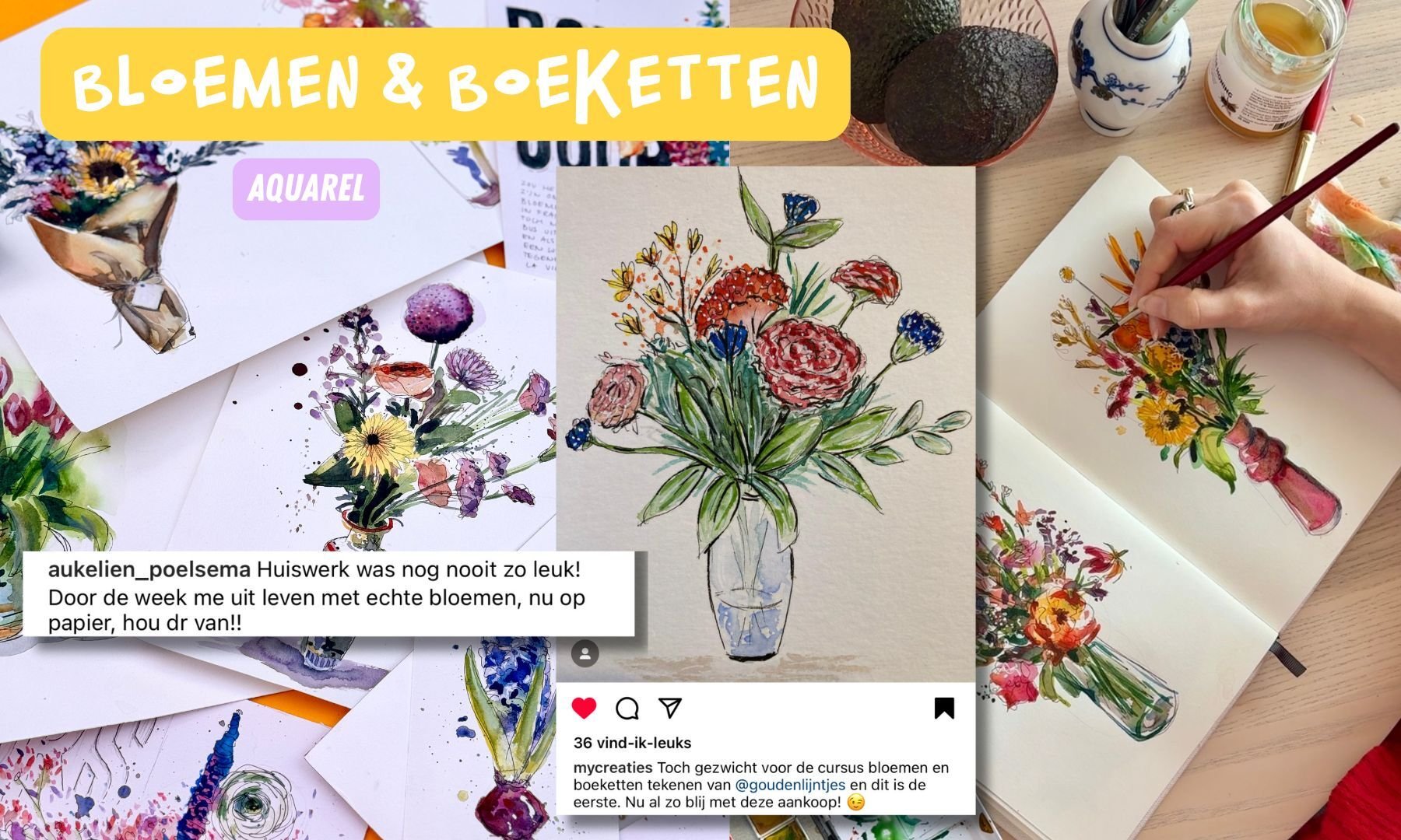 Een echte Gouden Lijntjes Golden Oldie! Wil je meer experimenteren met aquarel? Leer hoe je niet alleen losse bloemen schildert, maar ook hoe je een compleet plaatje opzet! In de cursus gaan we vooral aan de slag met aquarel, maar maken we wél gebruik van een schetspotlood en fineliner. Zet met een snelle losse stijl de fleurigste boeketten op papier.