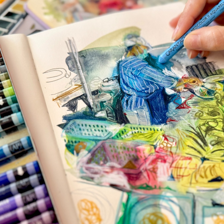 Deze is in zowel budget- als splurge-lijst hetzelfde, de Caran d’Ache Neocolor II zijn namelijk uniek in hun wateroplosbaarheid. Zelf heb ik zo’n 40 kleuren, maar 10 is een fijn begin (en je kunt mengen).