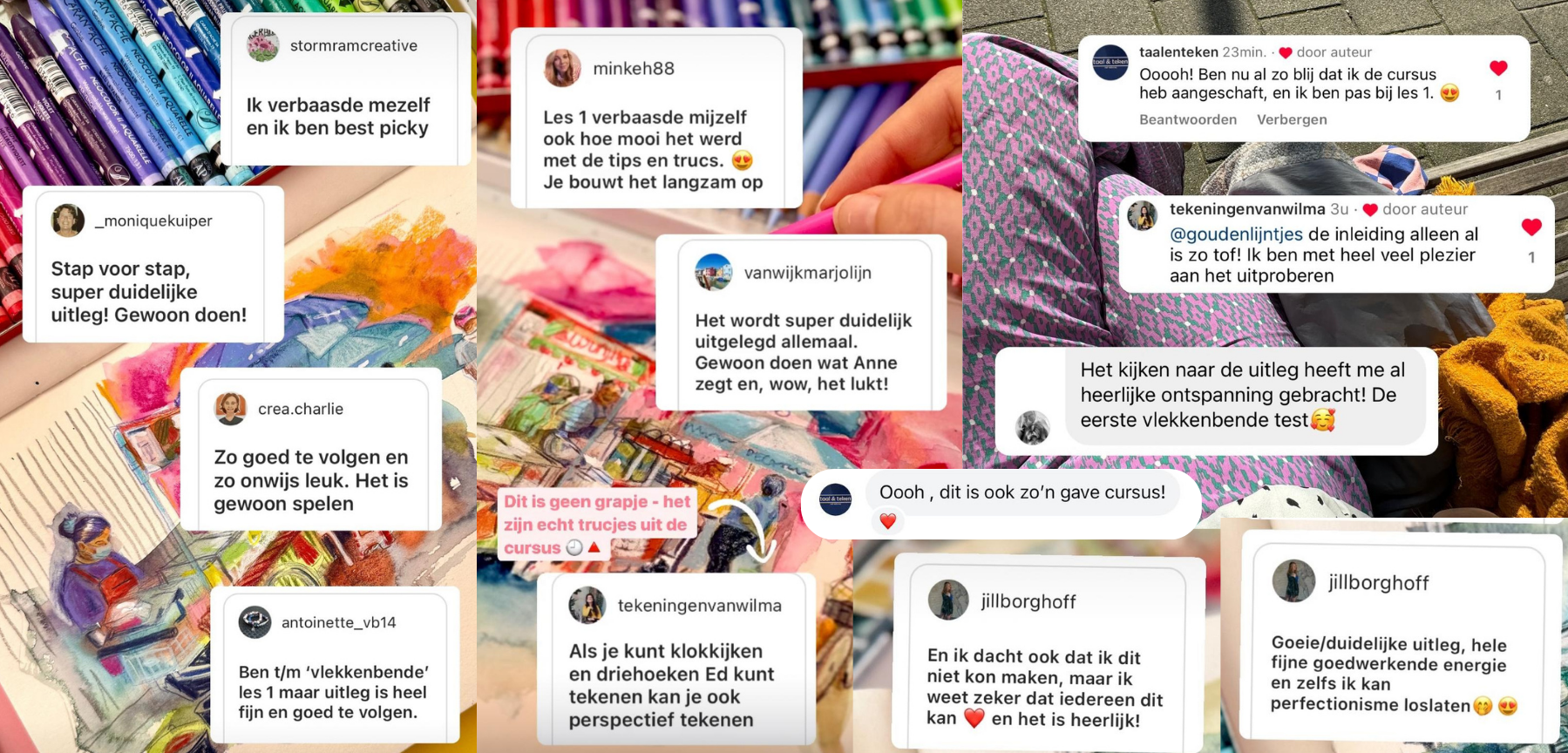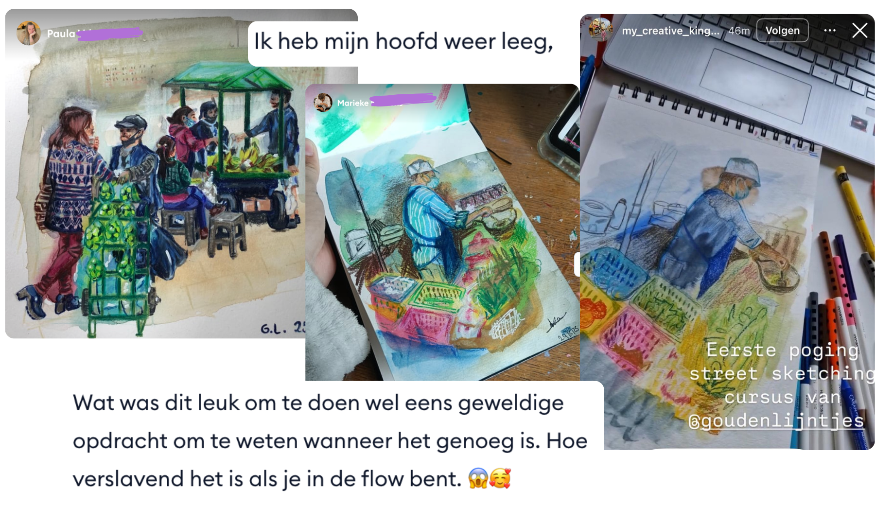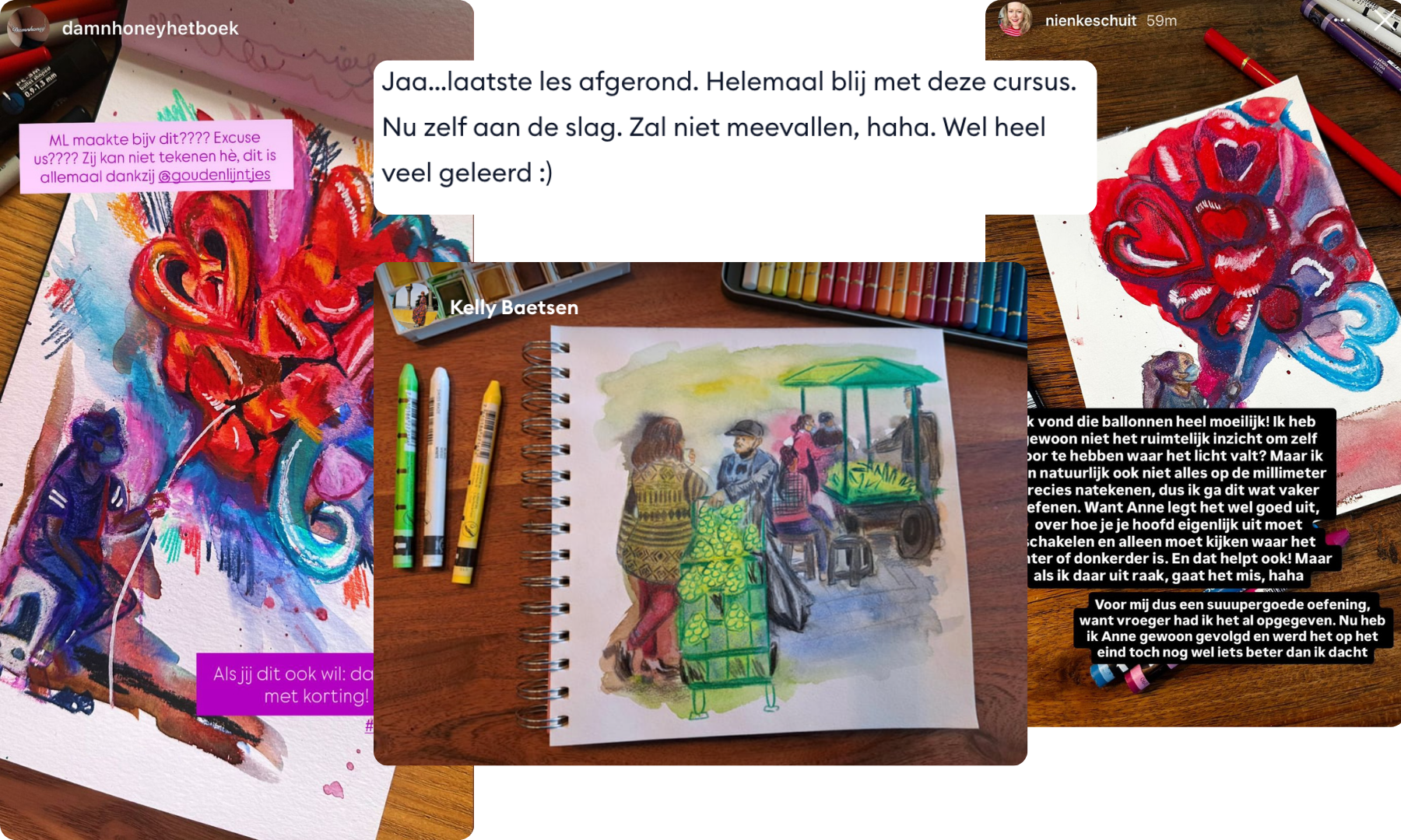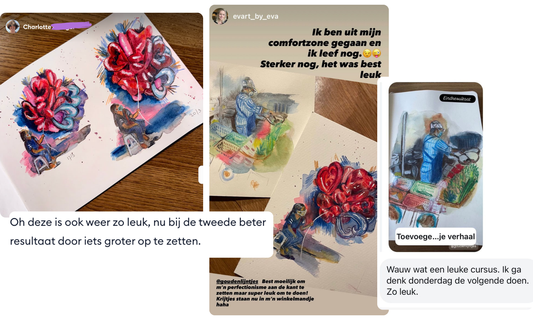Je krijgt daarnaast ook toegang tot een besloten groep waar je de resultaten kunt delen met andere deelnemers én gratis toegang tot de Gouden Lijntjes community, waar je lekker door kunt kletsen en tekeningen kunt delen met duizenden andere tekenliefhebbers.
