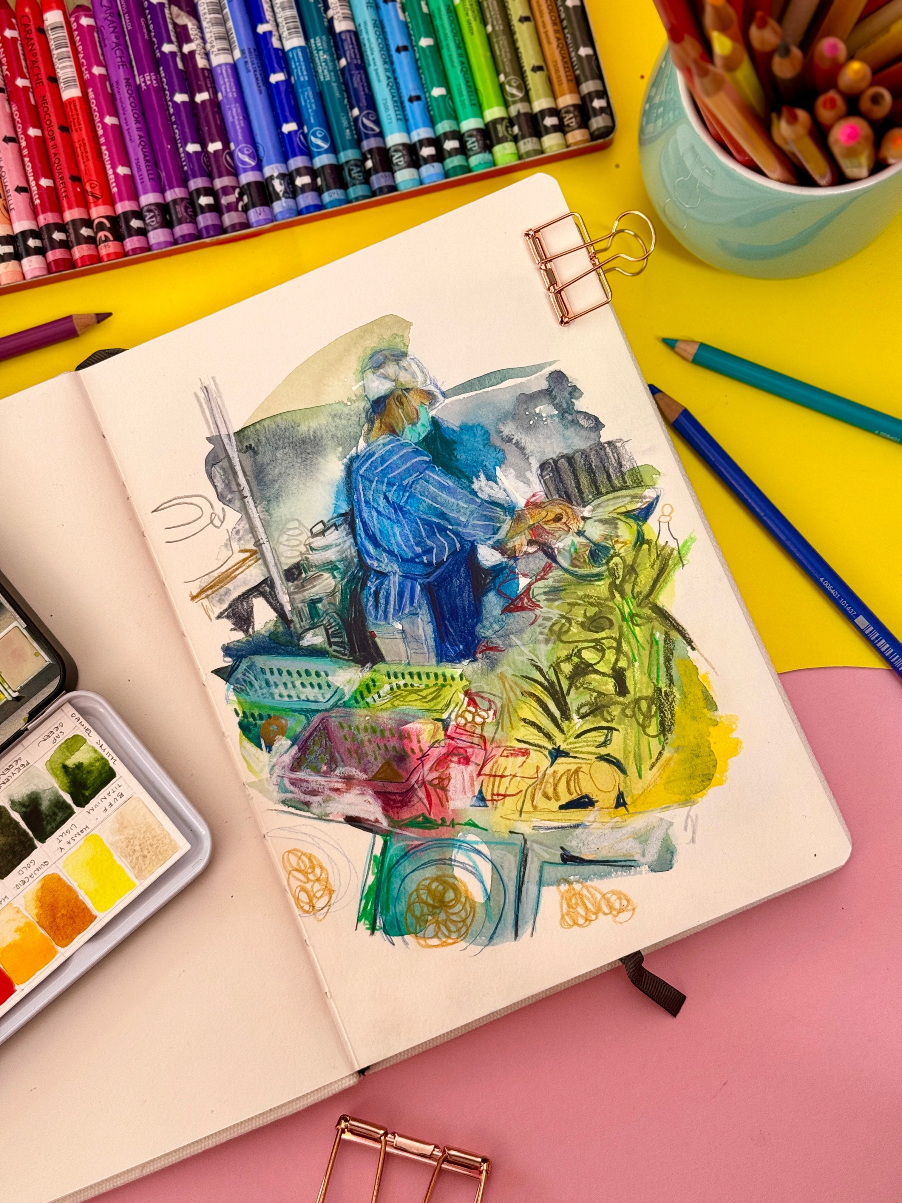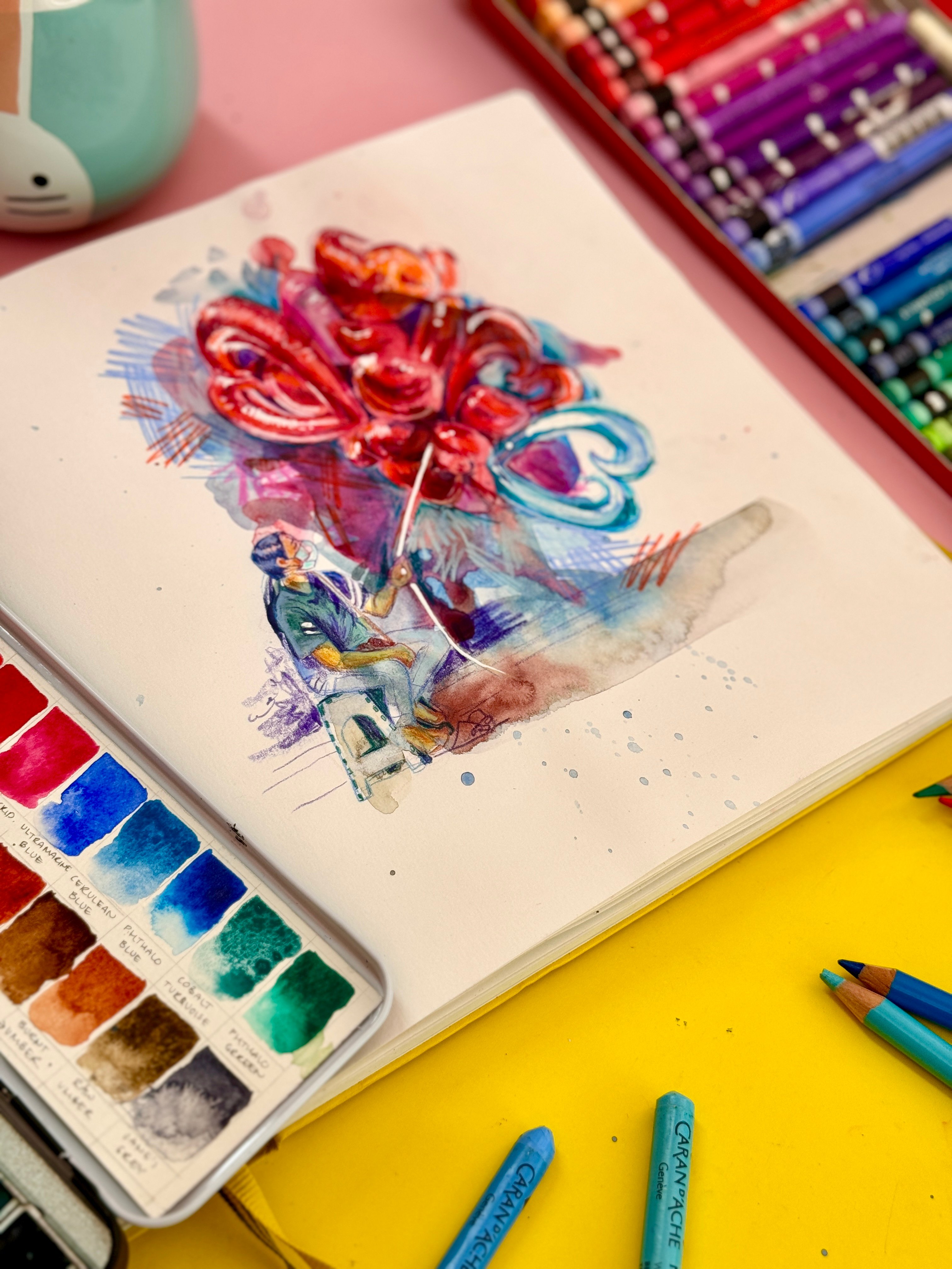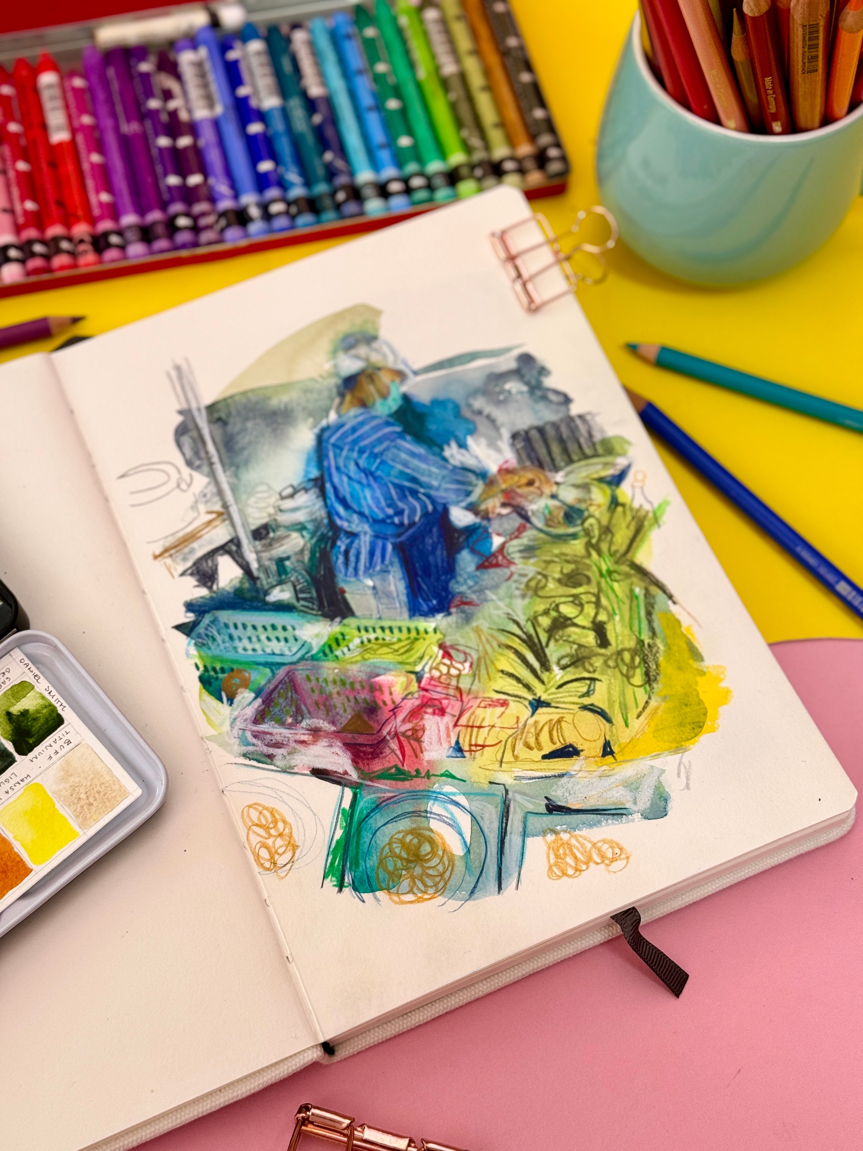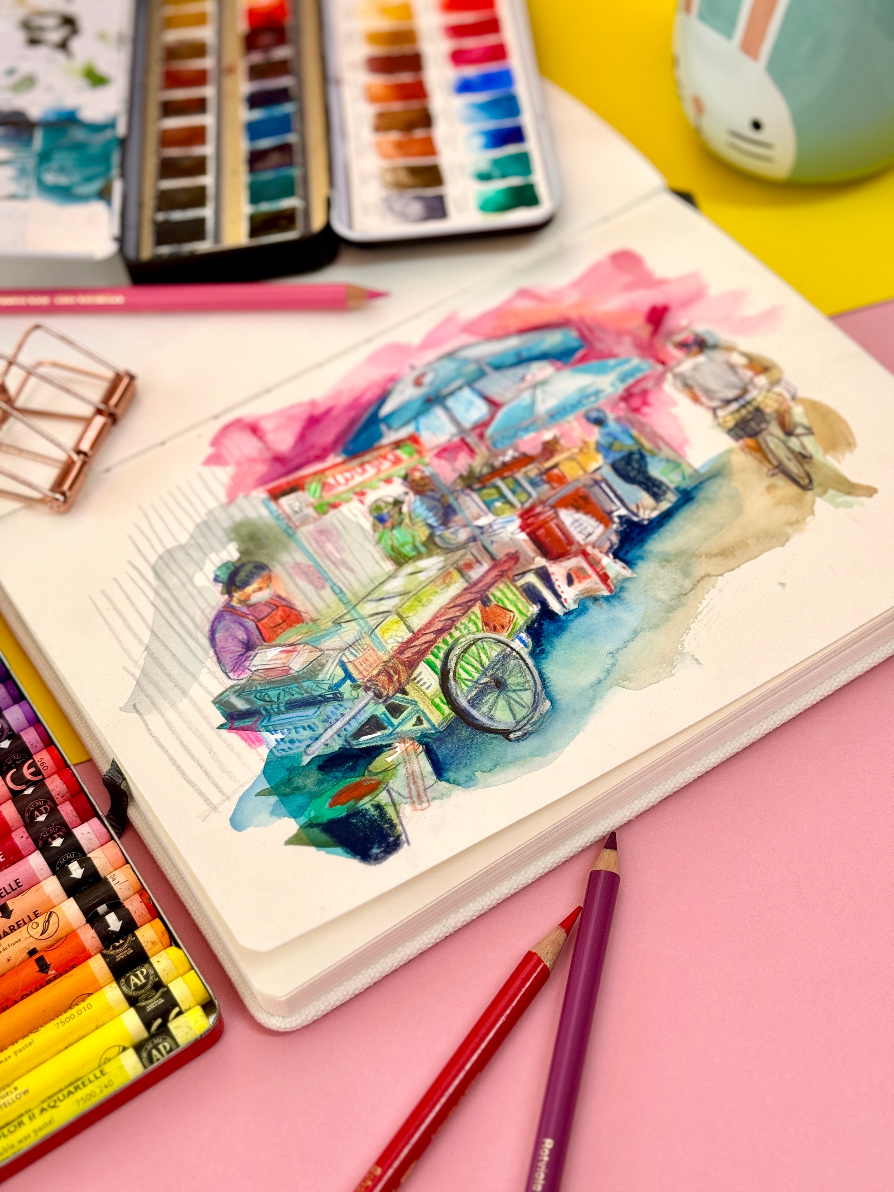 Deze speelse mixed media stijl tilt je journaling skills naar een hoger niveau – een stapje verder dan mijn gebruikelijke basiscursussen. Maar let op: ook absolute beginners kunnen gewoon meedoen. Ik begeleid je namelijk vanaf het begin om die chaotische straatscènes, inclusief mensen, behapbaar te maken – zelfs als je tot nu toe alleen stokpoppetjes tekende (met vaak maar drie tenen ;).