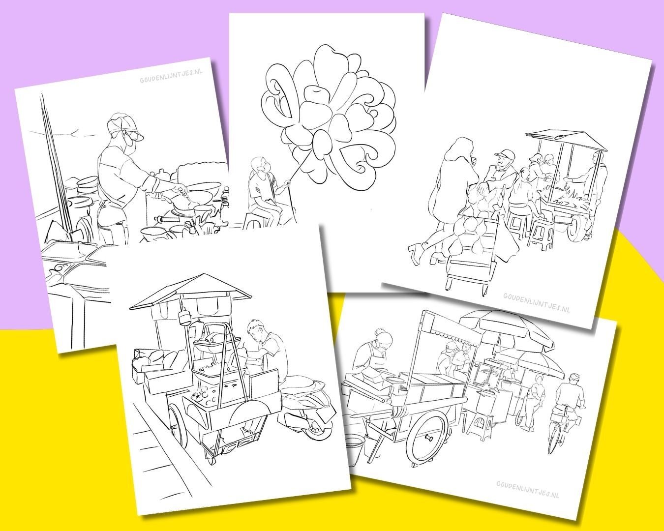 Aan het eind van de cursus heb je 4 mooie Thaise straattaferelen getekend*, en de vaardigheden in handen om voortaan zelf aan de slag te gaan.