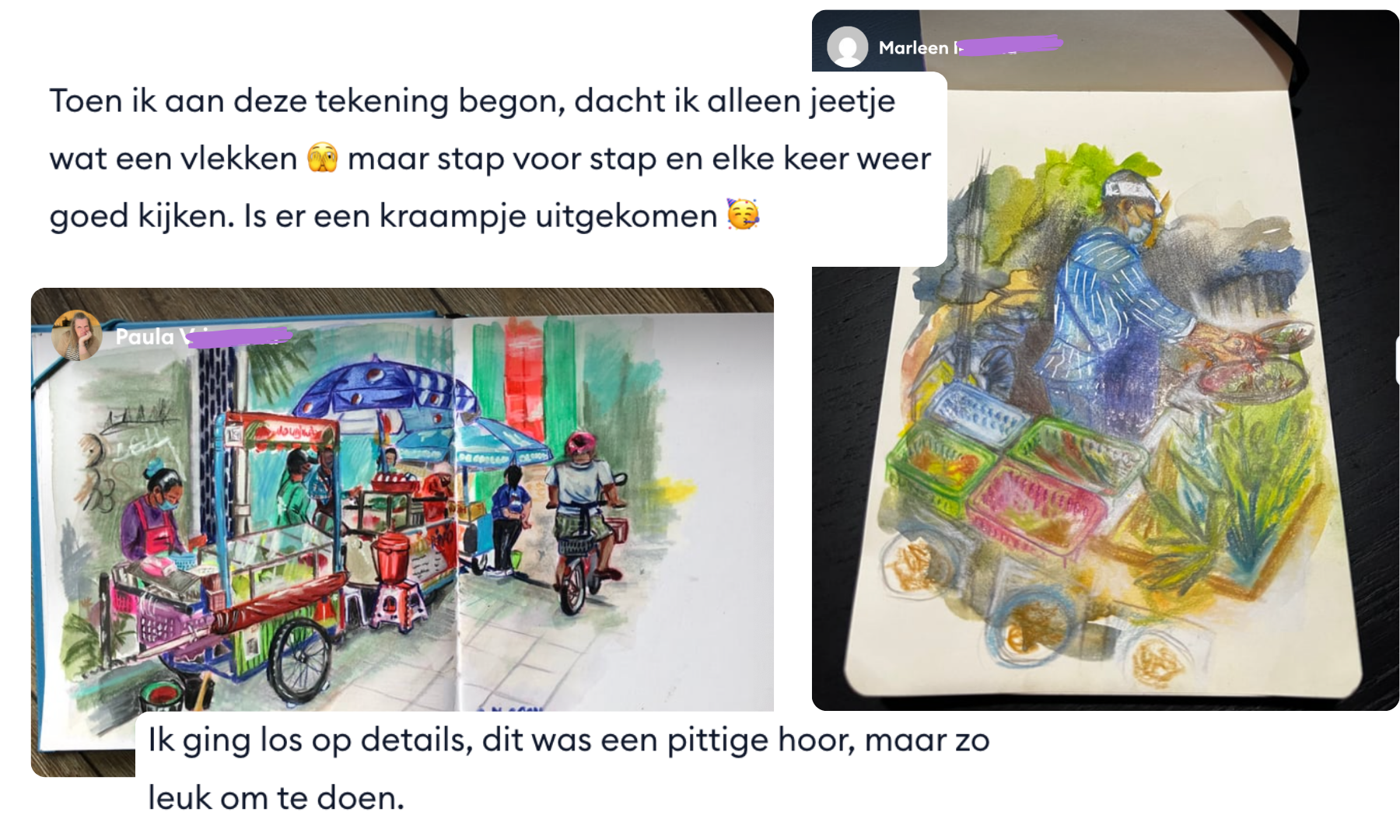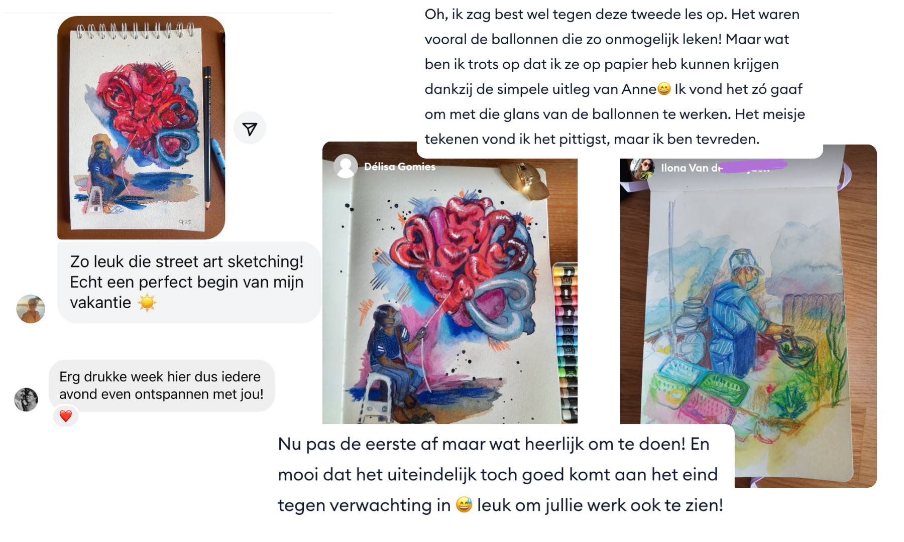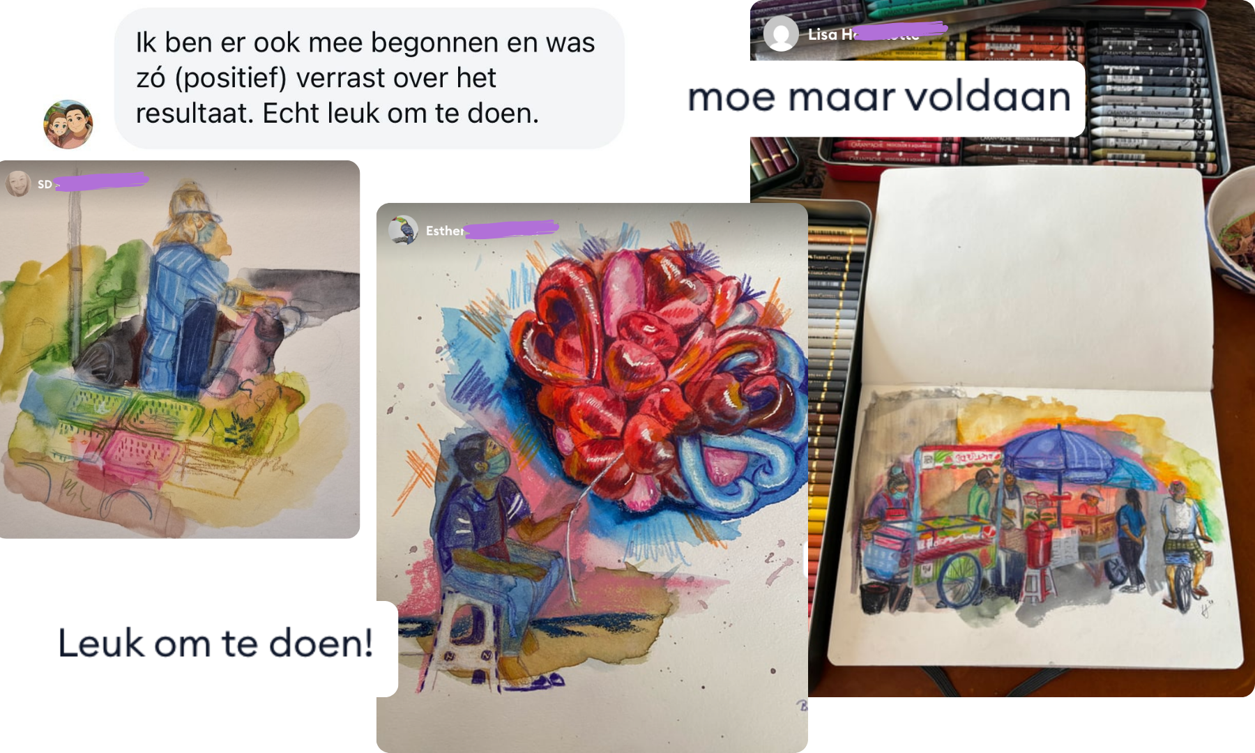 "Wat een leuke cursus is dit... Ik vond de tekeningen van Anne al zo mooi als die voorbijkwamen en ik wilde dat ook kunnen om mijn (vroegere) reizen vast te leggen! In het begin lijkt het eng: hoe kun je nou goed personen tekenen? En die hele compositie? Maar het lukt gewoon! En ook leuk om verschillende materialen te combineren, je tekening ziet er meteen echt lekker arty uit. lekker om zo los met de krijtjes te werken. Ik ga zeker oude vakantiefoto's opsnorren en aan de slag!"