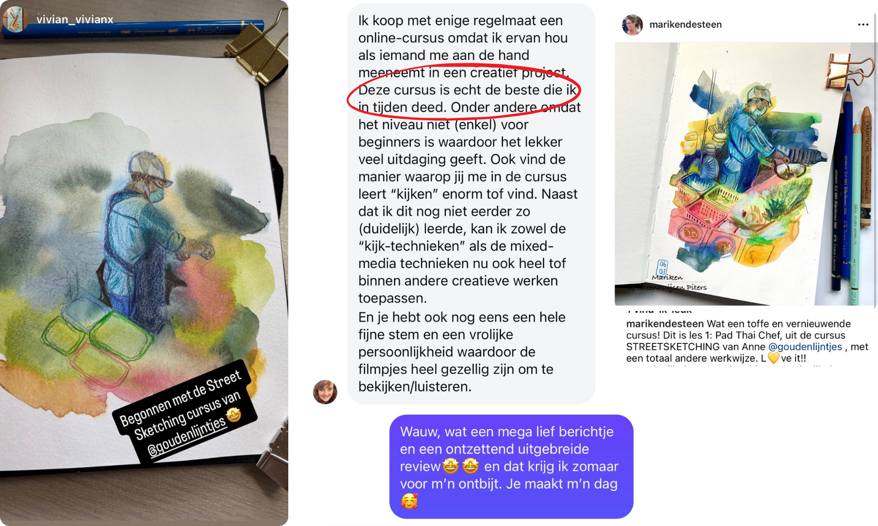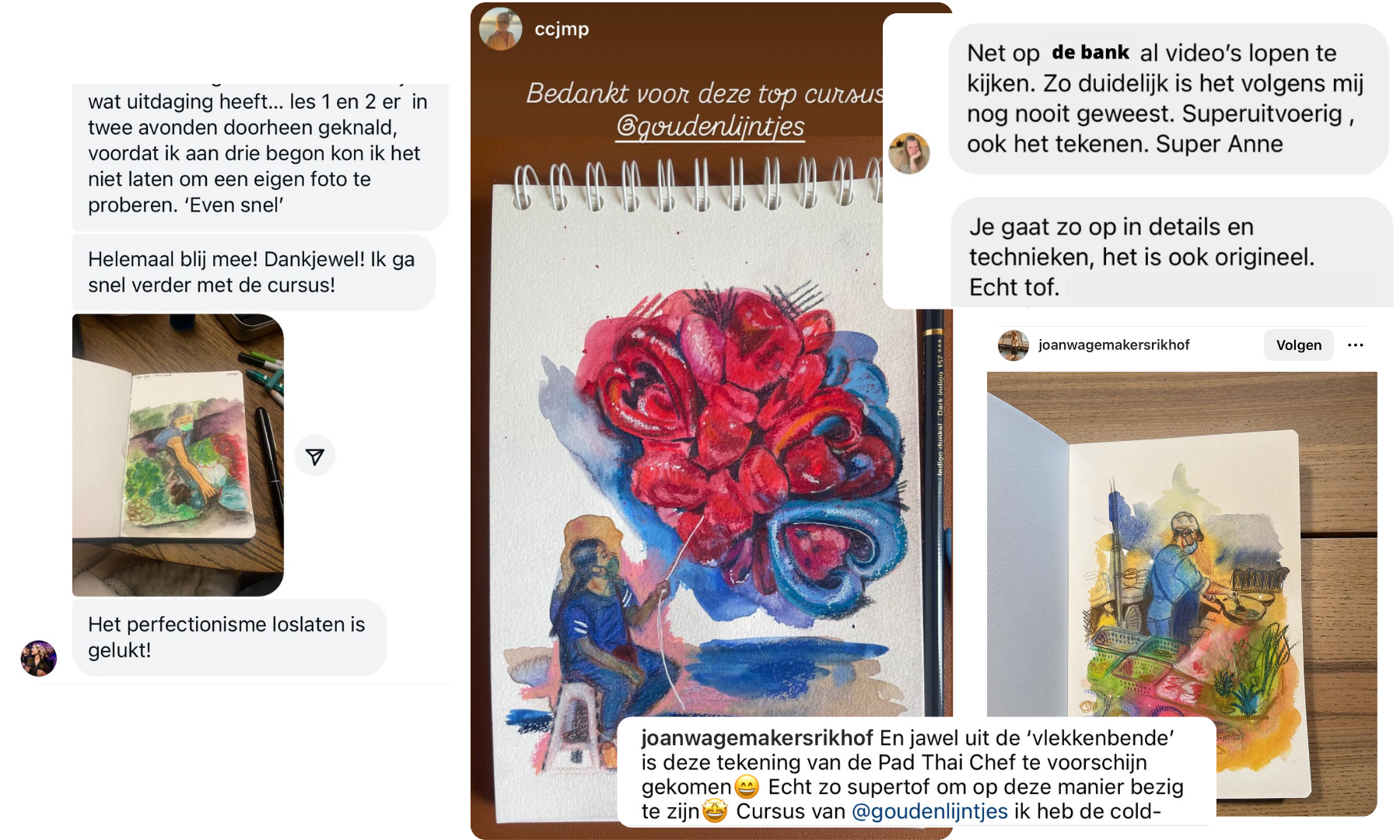 Community: als cursist krijg je automatisch toegang tot de Gouden Lijntjes community, waar je naar hartelust kan kletsen en delen over tekentips, tekenmateriaal, en tekenuitjes met meer duizenden nieuwe tekenmaatjes.