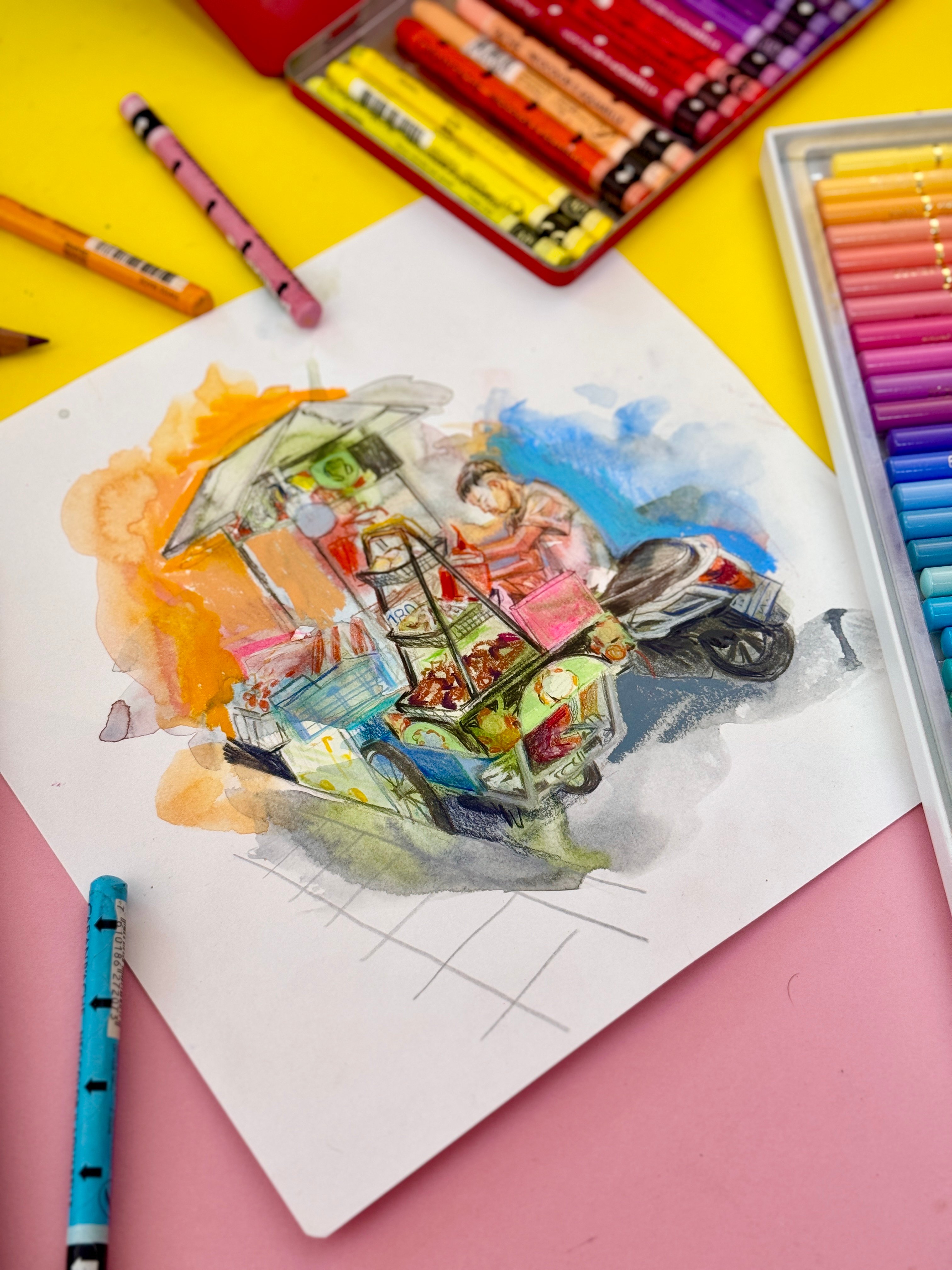 Na al jullie nieuwsgierige blikken in mijn schetsboek vol Thaise straatbeelden, heb ik de ins en outs van deze mixed media tekenstijl in cursusvorm gegoten: mijn “Street Sketching” cursus is een feit!