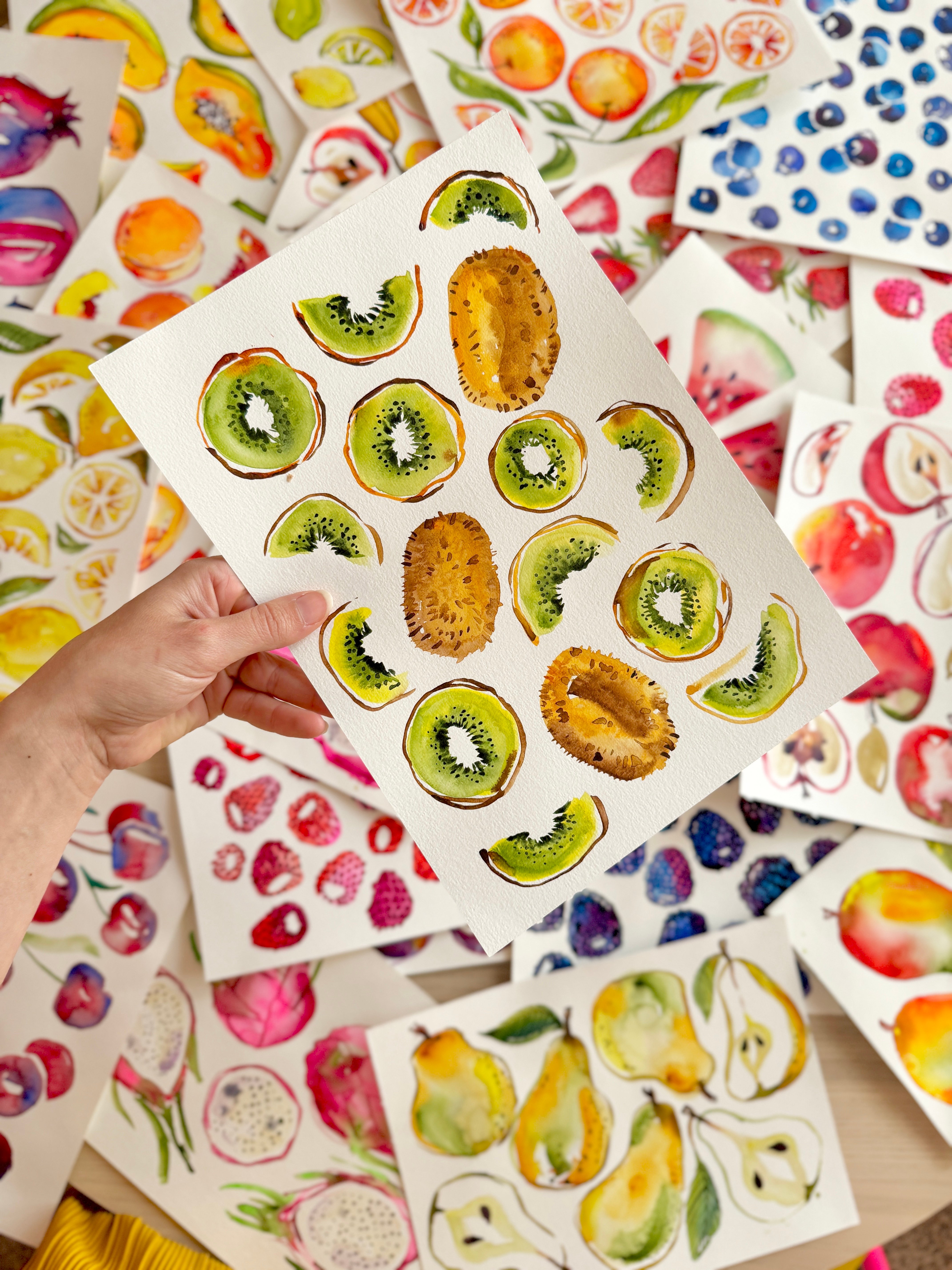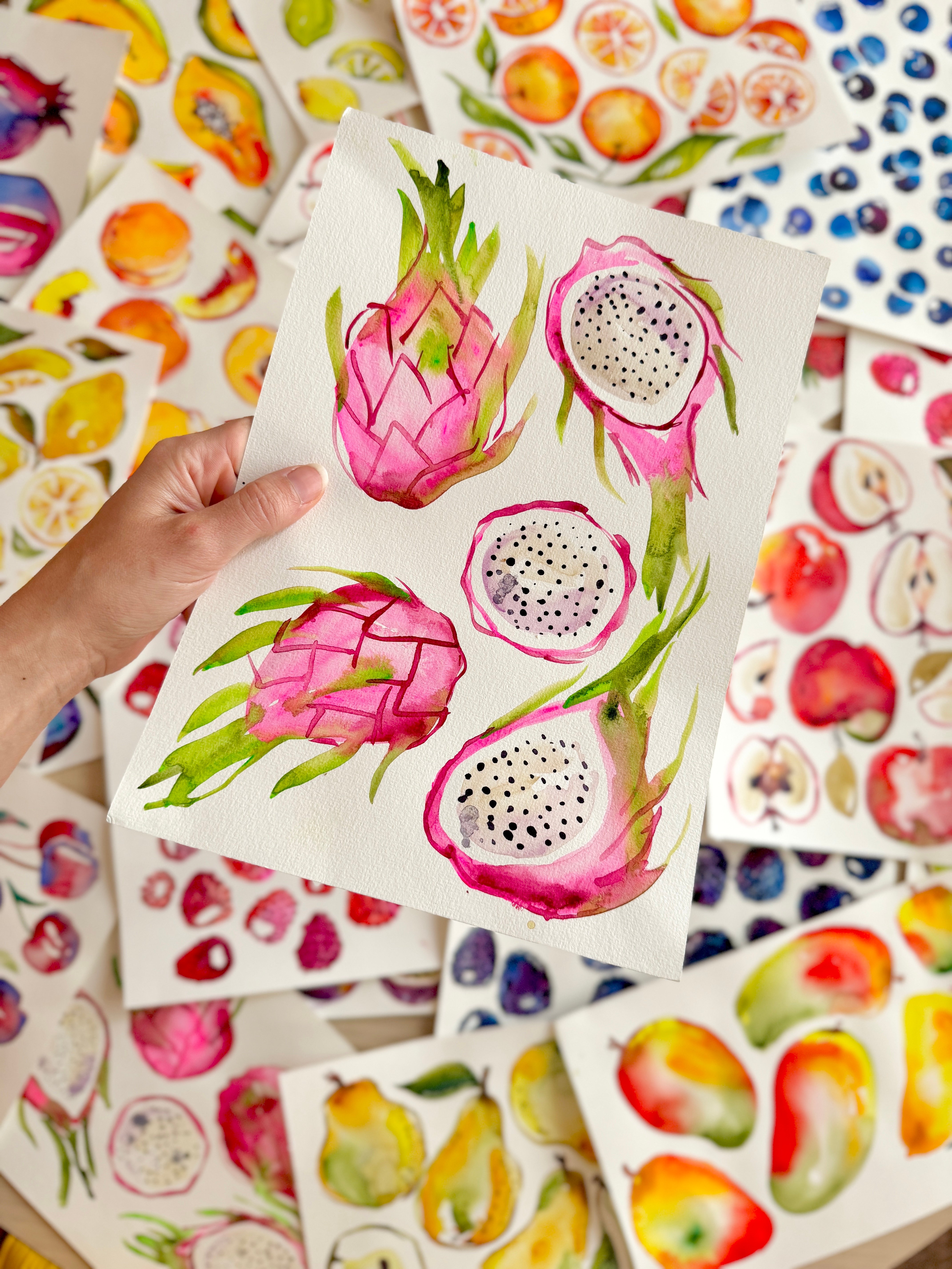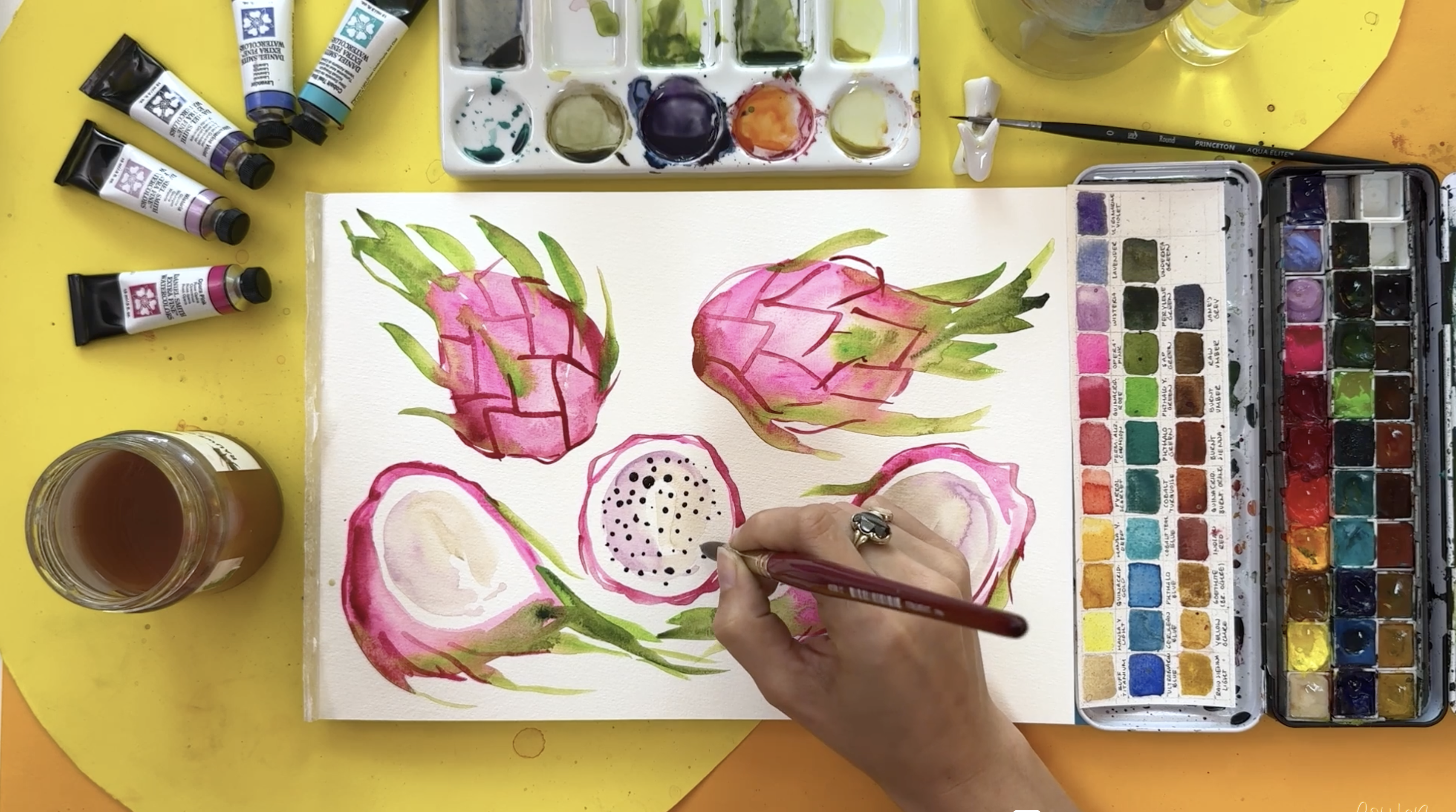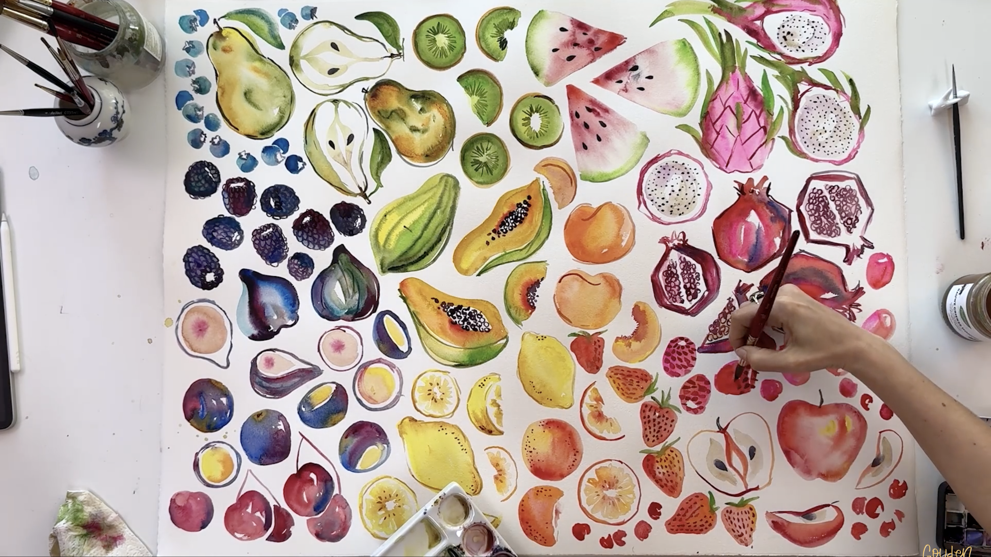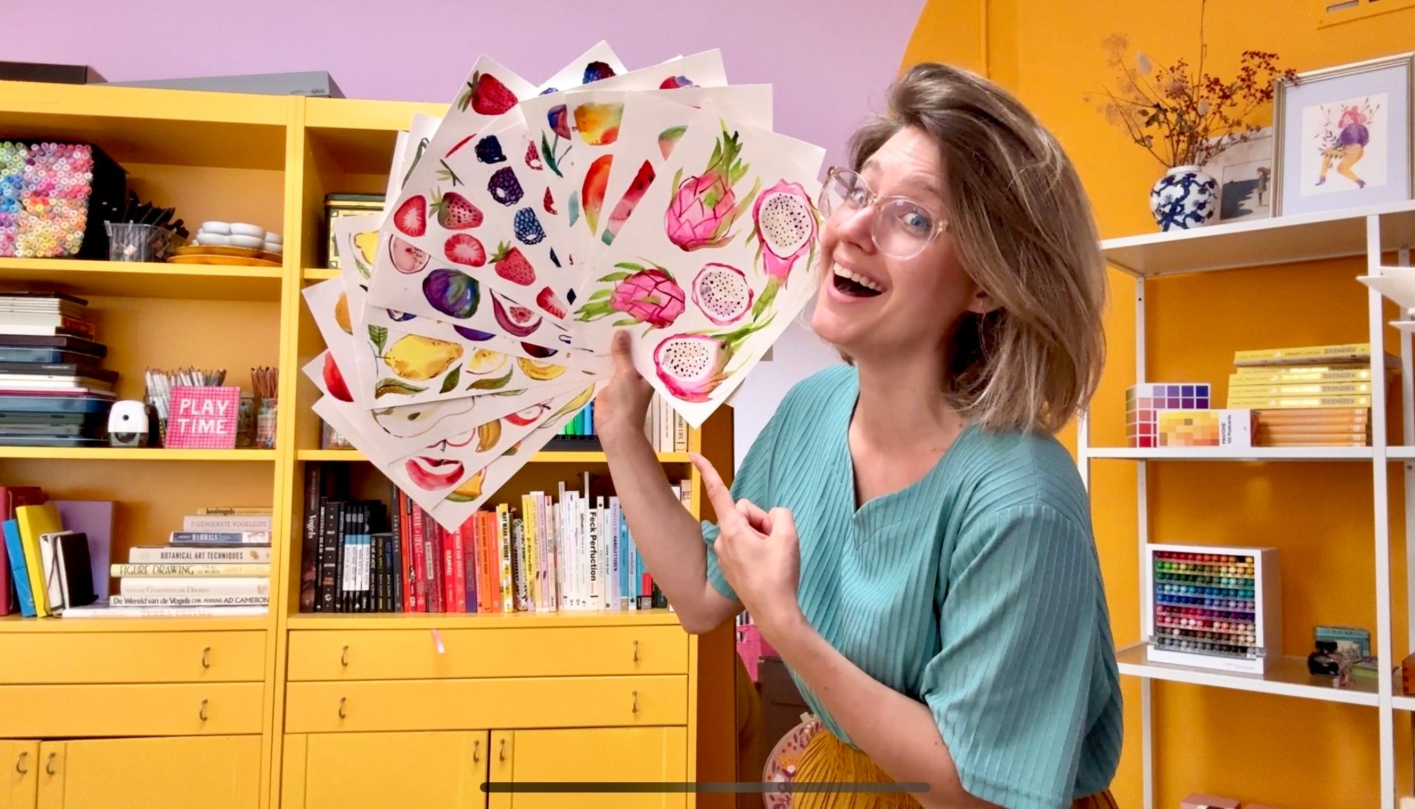 Met de techniek in de vingers is het tijd om te gaan oefenen! We schilderen samen in korte lessen 13 soorten fruit van begin tot eind, per video oefenen we een bepaalde aquareltechniek. De hele regenboog komt voorbij. Op volgorde: watermeloen, mango, kers, framboos, braam, aardbei, passievrucht, vijg, citroen, peer, appel, papaya, pitaya (drakenfruit).