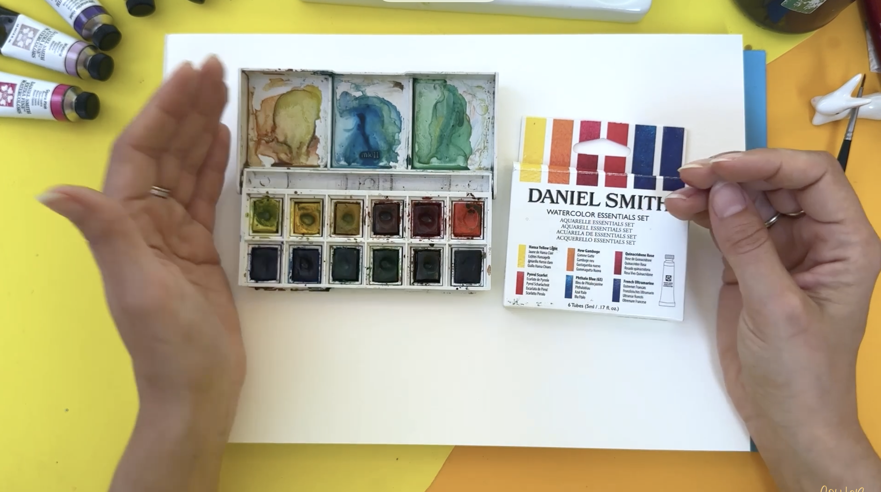 Ik gebruik tijdens de cursus deze Daniel Smith 24 half pan set, met een aantal aanvullende kleuren (Opera Pink, Wisteria, Ultramarine Violet, Lavender, Cobalt Teal Blue, Phthalo Yellow Green)