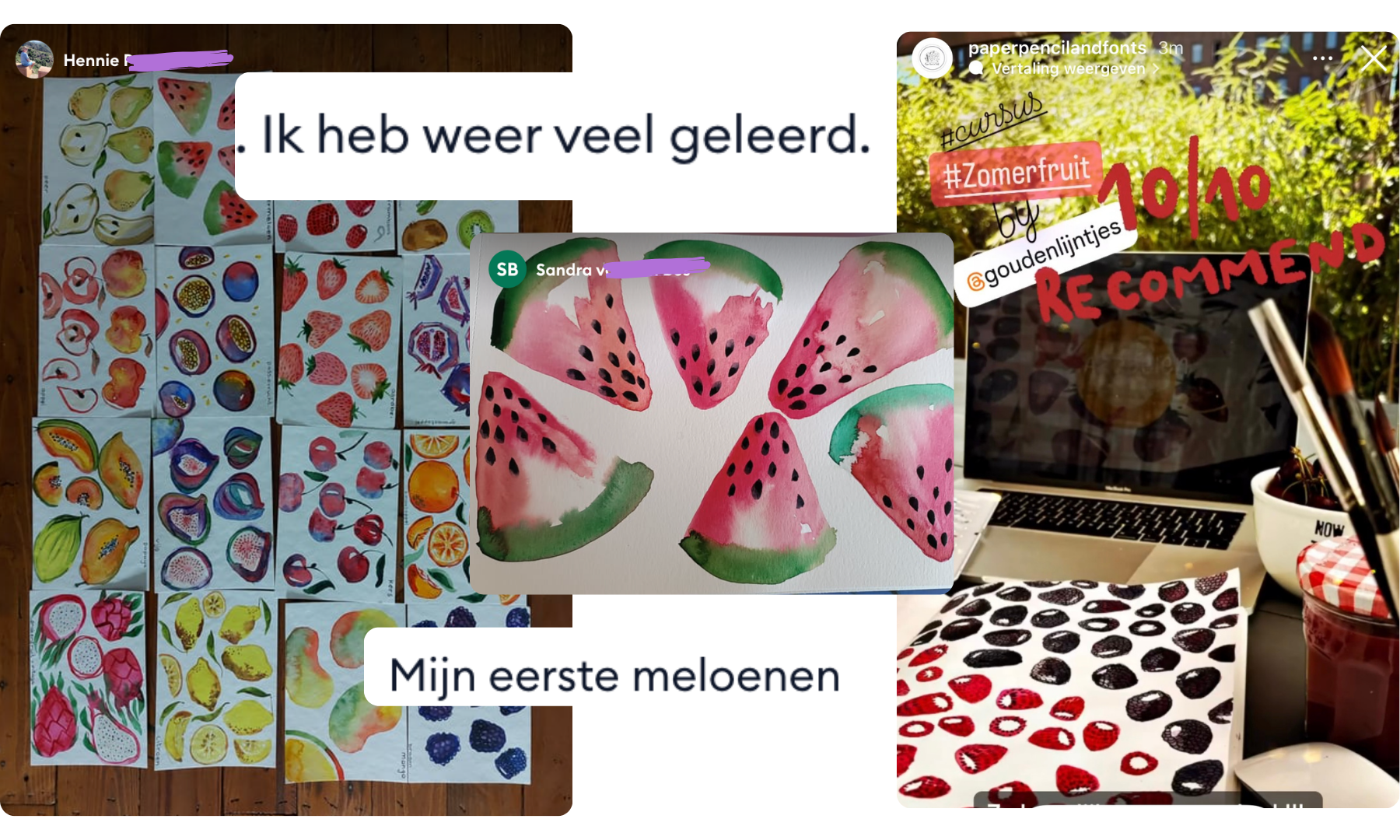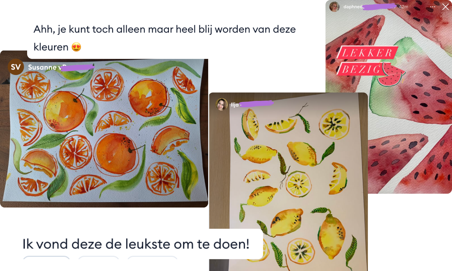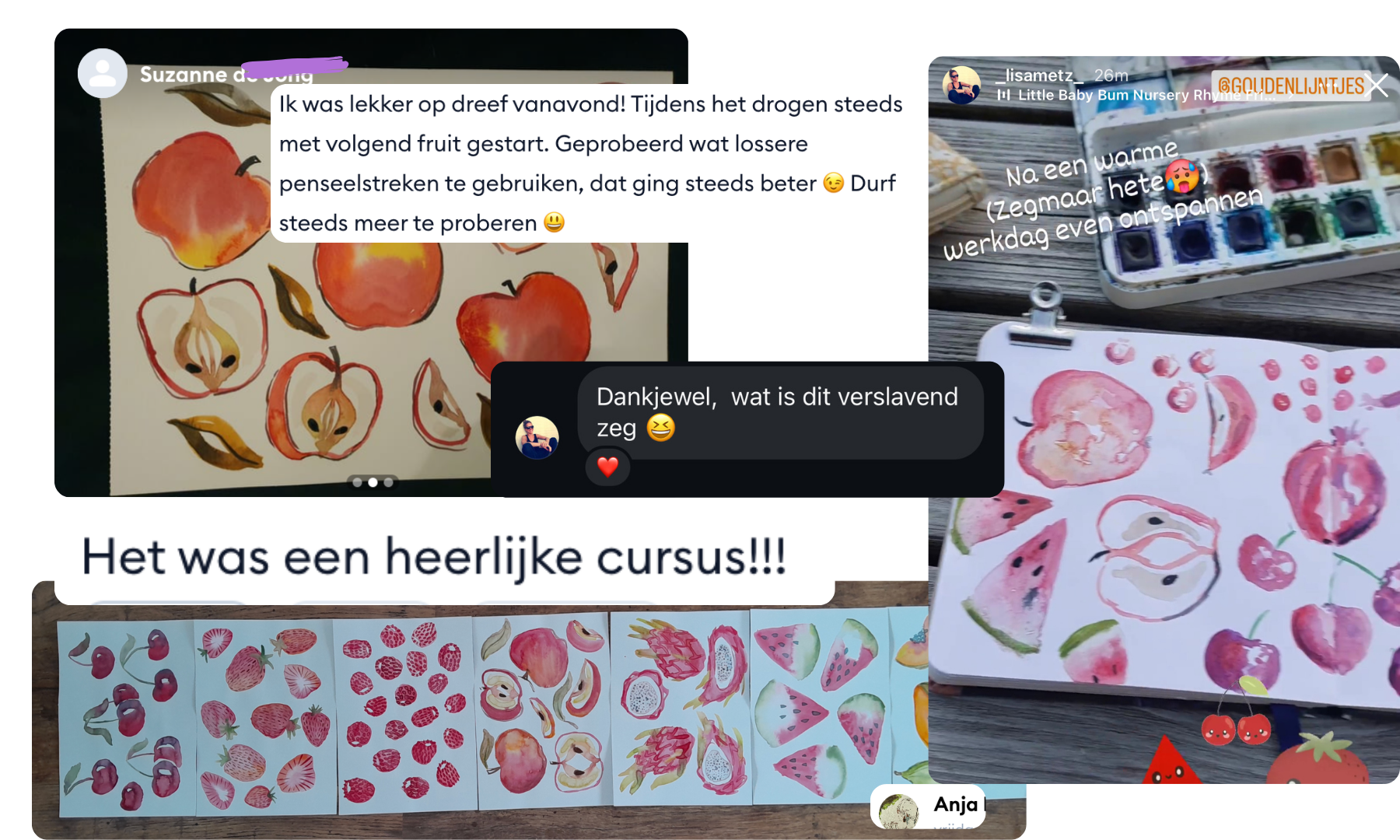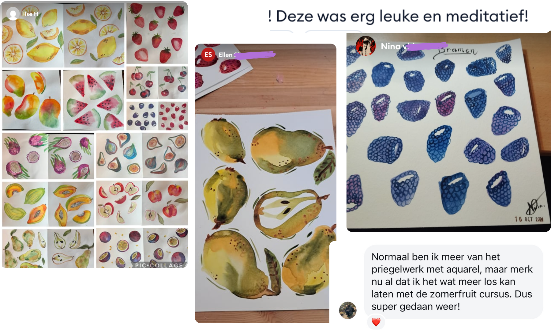 "Wat een lekkere cursus. Niet die perfecte peer op papier zetten maar wel zien dat het een peer is! Zo fijn om dat penseel te pakken en gewoon te doen en zien dat het lukt en erg leuk is om te doen."