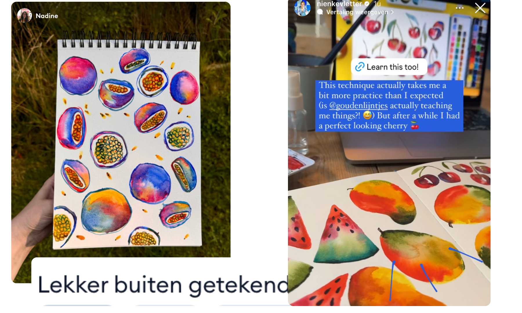 Je krijgt daarnaast ook toegang tot een besloten groep waar je de resultaten kunt delen met andere deelnemers én gratis toegang tot de Gouden Lijntjes community, waar je lekker door kunt kletsen en tekeningen kunt delen met duizenden andere tekenliefhebbers.